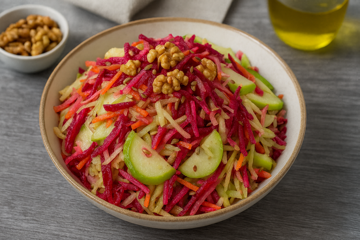 Этот салат — настоящий взрыв пользы и вкуса. Хрустящая капуста, сочное яблоко, сладковатая свёкла и морковь создают идеальное сочетание. А добавление свежего огурца, орехов и ароматного соуса делает вкус ярче и богаче. Он не только очищает организм, но и бодрит, насыщает витаминами и отлично подходит как лёгкий ужин или гарнир к мясным блюдам. Ингредиенты: