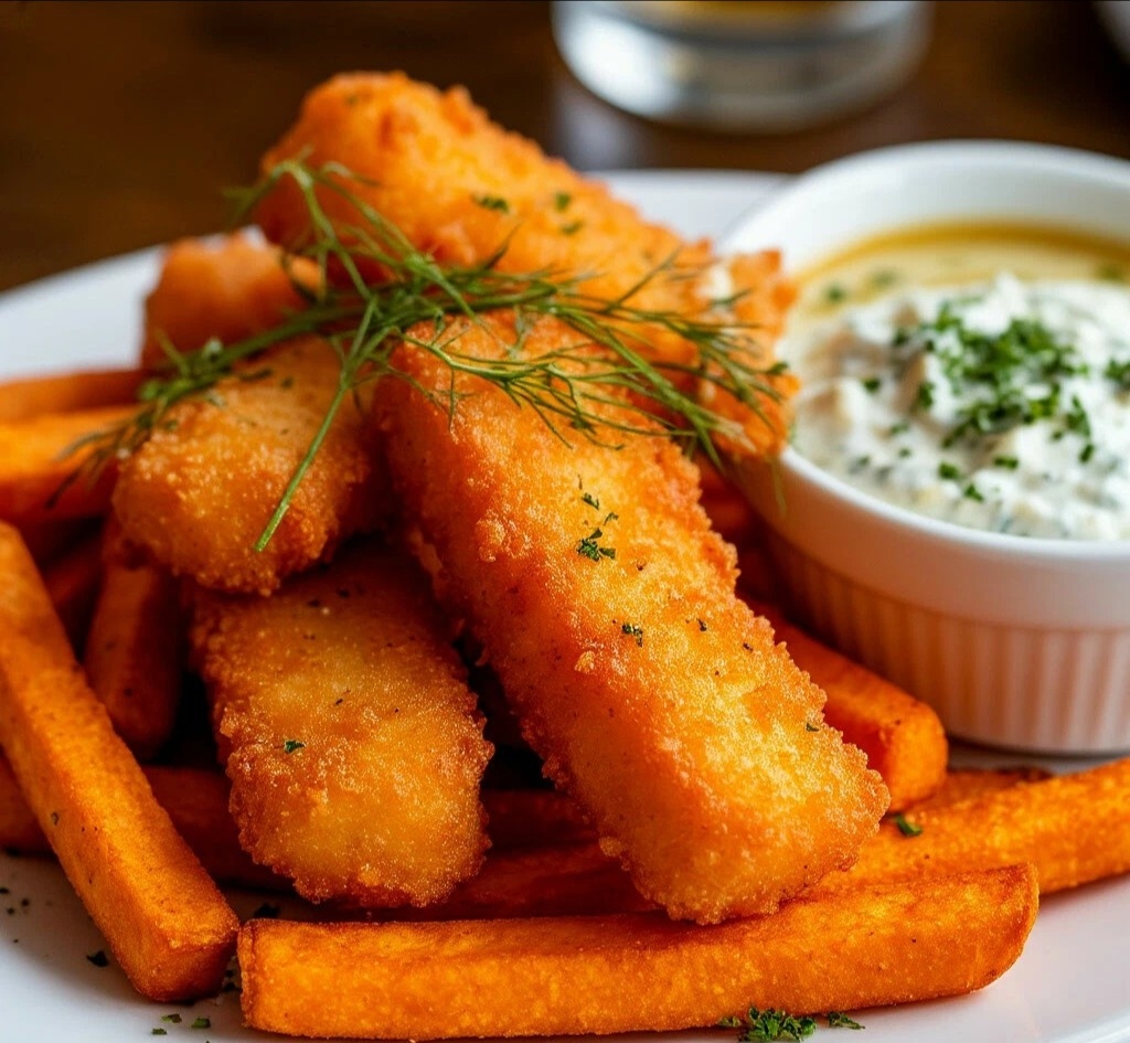 ГОРЯЧЕЕ — «РЫБНЫЕ ПАЛОЧКИ В ПИВНОМ КЛЯРЕ С БАТАТОМ ПО-КОПЧЁНОМУ И СОУСОМ ТАР-ТАР» Мяу, мои пушистые ценители хруста и сочности! 😺 Готовы превратить обычные замороженные рыбные палочки в кулинарный триумф? Сегодня мы возьмём их, окунем в невесомый пивной кляр, подадим с дымчатым бататом и пикантным соусом... И получим блюдо, достойное паба с мишленовской звездой! 🍻✨ РЫБНЫЕ ПАЛОЧКИ В ПИВНОМ КЛЯРЕ С БАТАТОМ ПО-КОПЧЁНОМУ И СОУСОМ ТАР-ТАР Идея: Хрустящий кляр, дымчатый батат и пикантный соус превращают простую рыбу в гастрономический восторг. ИНГРЕДИЕНТЫ (на 2-3 порции): 🧾 · Рыбные палочки замороженные — 8-10 шт. · Для батата: Замороженный батат фри — 300 г, оливковое масло, копчёная паприка, молотый копчёный чеснок, соль. · Для кляра: Светлое пиво — 100 мл (ледяное!), мука — 100 г, яичный белок — 1 шт., соль. · Для соуса тар-тар: Майонез — 4 ст.л., маринованные огурцы — 2 шт., каперсы — 1 ч.л., чеснок — 1 зубчик, зелень (петрушка/укроп). ВРЕМЯ ПРИГОТОВЛЕНИЯ: ⏰ 30 минут СЛОЖНОСТЬ:?