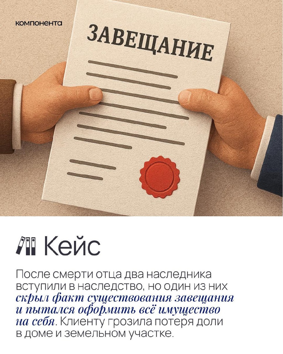 В одном из наших кейсов клиент чуть не остался без доли в доме и участке, потому что другой наследник скрыл завещание, но мы оперативно обратились в суд, доказали наличие документа и восстановили права клиента.