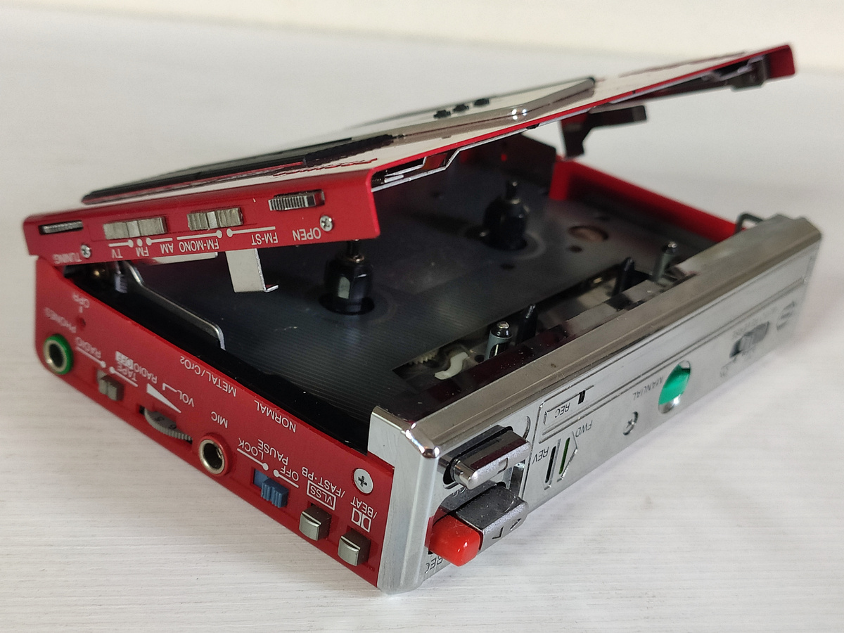 Эта модель кассетного стерео плеера сохраняет устойчивый спрос на вторичном рынке и, возможно не худший, чем у культового Sony WM-20. Такое стало возможным не в последнюю очередь благодаря дизайну. Цветовая палитра отделки и качество применяемых материалов не могут оставить равнодушными любителей техники, как сейчас, так и почти полвека назад. Штампованный алюминий, облитый малиновой глазурью с профилированными логотипами и металлическими органами управления - разве не поэзия инженерной мысли? Отделка хромом функциональной панели с клавишами да светящимися, на контрасте с красным, маленькими зелеными светодиодами, просто "отвал бошки". Что мы имеем в техническом плане? Прежде всего это авто-реверсный плеер с радиоприемником, шкала которого расположена на откидной крышке. Поскольку аппарат с японского рынка, FM прием отличается от европейского и не в лучшую сторону. Однако TV диапазон расширяет возможности. Одной из важных опций - многофункциональная запись на кассеты. Кроме этог
