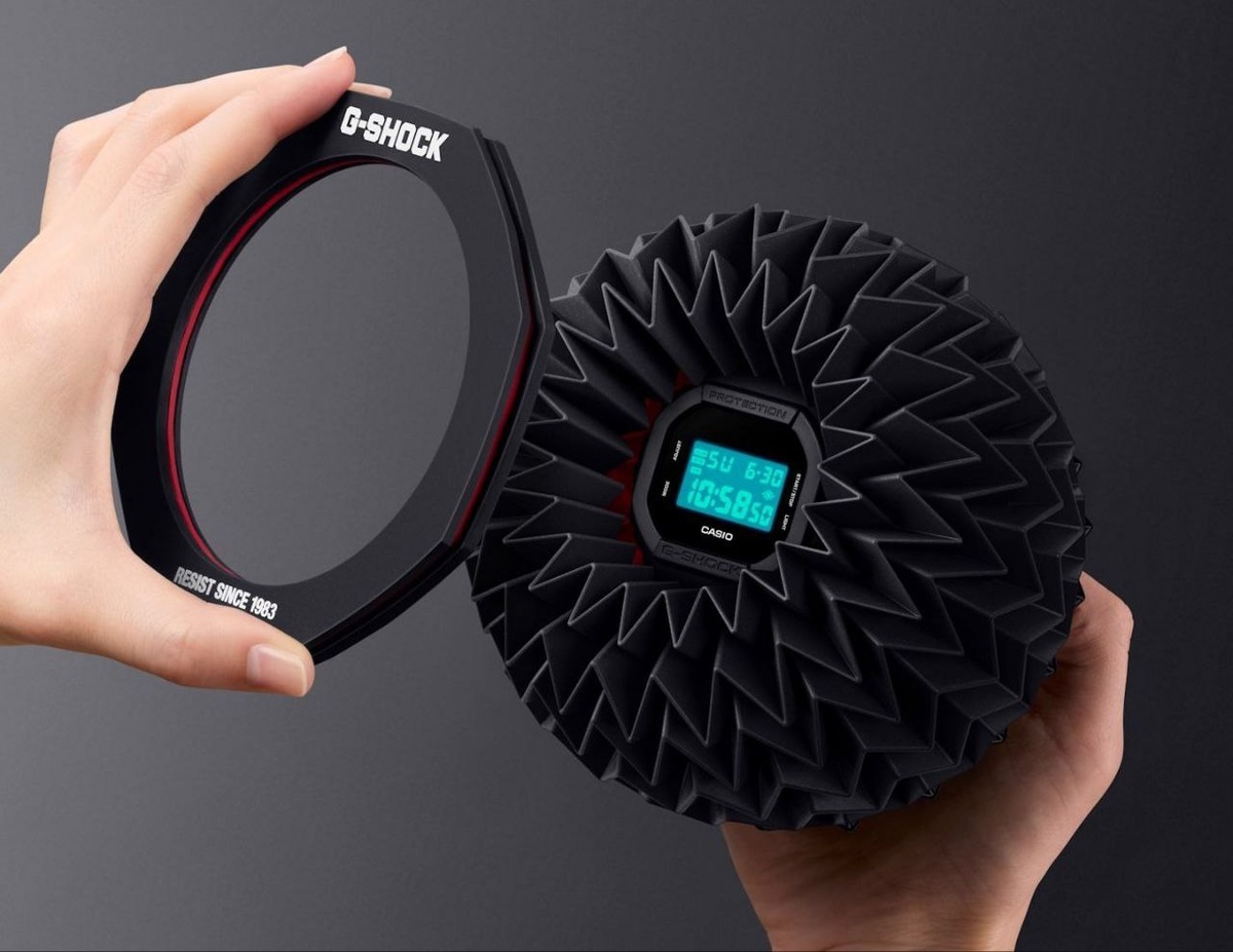 Золото на бельгийской премии завоевала оригинальная упаковка из бумаги, выполненная в технике «Миура-ори» – одной из разновидностей оригами. Она еще в 1970-х годах предлагалась в качестве методики для развертыыания установок солнечных батарей на космических спутниках. Удивительно, что многократно сложенную бумагу «Миура-ори» можно развернуть всего одним движением, а упаковка при этом гораздо более надежная и лучше защищает часы от механического воздействия. В упаковке G-Shock бумага дополнительно закрепляется фирменным восьмиугольником.