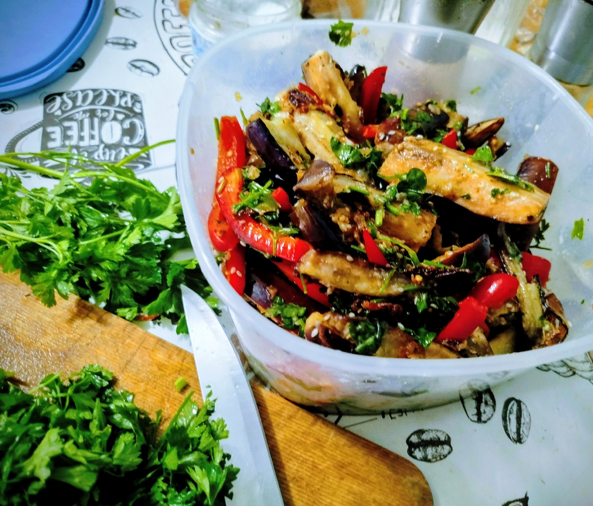 Всем прекрасных выходных, последних октябрьских 🍂. Сделаем снова закуску из баклажанов. В прошлый раз были тонкие кружочки, теперь бруски. Эта закуска не менее вкусная 😋 Столько блюд открыла для себя с баклажанами, учитывая, что раньше единственным у меня были только жареные баклажаны с майонезом и чесноком. Всё! Какие блюда с баклажанами уже есть на канале? 👇 🍆 рататуй, 🍆 две закуски с маринадом, 🍆 фаршированные лодочки, 🍆 сезонный салат. Рецепты по баклажану находятся в отдельной подборке. Очень удобно! 👍 Границы расширяются, и это замечательно 🥰 Итак, закуска "Брусочки в маринаде". Ингредиенты: 🔸 Баклажаны - 3 шт. 🔸 Кукурузный крахмал - 3 ст.л. 🔸 Соль - щепотка Для маринада: 🔸 Болгарский перец - 0,5 шт. 🔸 Чеснок - 3 зубчика 🔸 Черный перец - по вкусу 🔸 Кунжут - 2 ч.л. 🔸 Соевый соус - 4 ст.л. 🔸 Сахарный песок - 1 ч.л. 🔸 Сок половинки лимона 🔸 Растительное масло - 2 ст.л. 🔸 Зелень свежая - по вкусу Нарезать баклажаны на брусочк