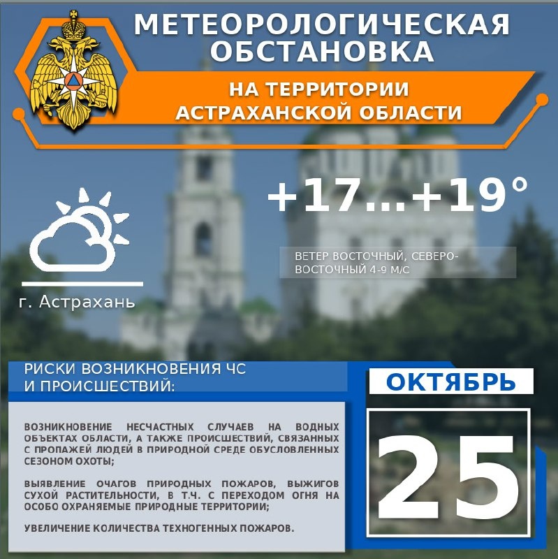 🍂Метеорологическая обстановка на 25 октября 🌤На территории малооблачно. Ветер восточный,🌬 северо-восточный 4-9 м/с. Температура воздуха днем +14...+19°, ночью +4...+9°🌡. 🌤По г. Астрахань малооблачно. Ветер восточный, северо-восточный 4-9 м/с. Температура воздуха днем +17...+19°, ночью +6...+8°🌡. ✅Присоединяйся к МЧС Астрахань 👉🏼Подписывайся на МЧС России в Telegram | MAX