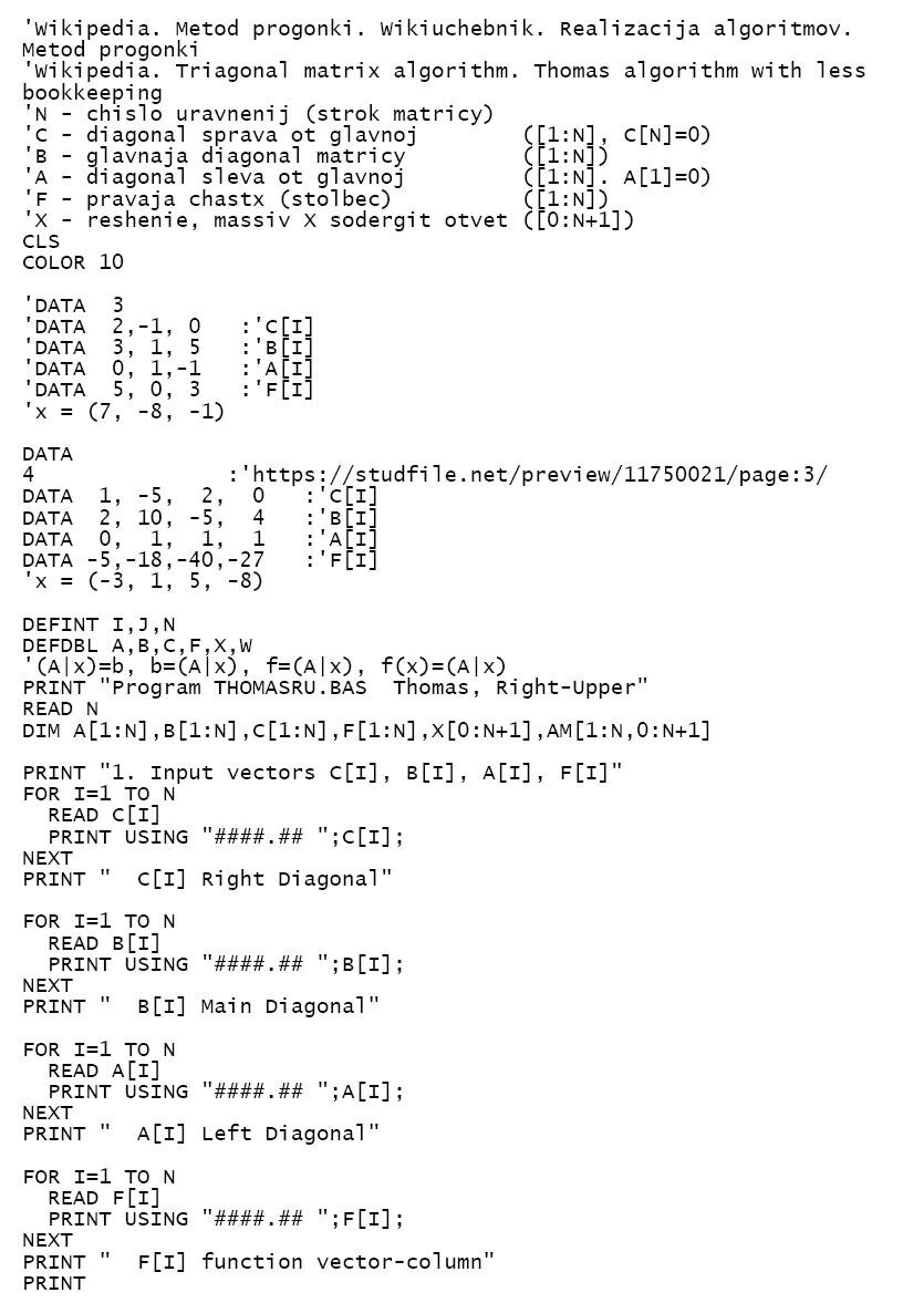 ............................................."Даром дадено, даром давайте", - Исус Христос. При вычислении глобальных кубических сплайнов [3] и в других задачах возникает необходимость решения систем линейных алгебраических уравнений (СЛАУ) с трёхдиагональной матрицей. СЛАУ с трёхдиагональной матрицей выгоднее решать не традиционным методом Гаусса, а его разновидностью для СЛАУ с трёхдиагональной матрицей - методом прогонки ("shattle"), который в англоязычной литературе называется алгоритмом Томаса [1][2] (1949г. [3]). Метод Гаусса требует O(n^3) арифметических операций, а алгоритм Томаса - O(n). Алгоритм Томаса имеет две разновидности: с сохранением и без сохранения исходных значений СЛАУ. Обе разновидности подробно описаны в статье [1]. В данной статье рассматривается разновидность алгоритма Томаса без сохранения исходных значений СЛАУ (an algorithm with less bookkeeping [1]). Так как Basic знают почти все, программа, реализующая алгоритм прогонки Томаса, была написана на Borland Tur