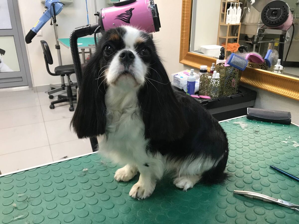 Кинг Чарльз спаниель. Подровнял торчки по телу, подстриг ушки, убрал очёсы с лап и сформировал попу. Салон Милорд Рублевское шоссе. Апрель 2025.