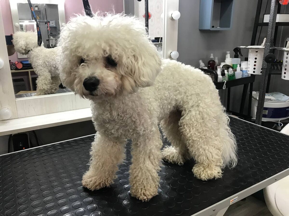 Бишон Спот. 1 годик. С кучей самострига на лапках и мордочке. Получился дизайнерский вариант стрижки. Хозяин доволен