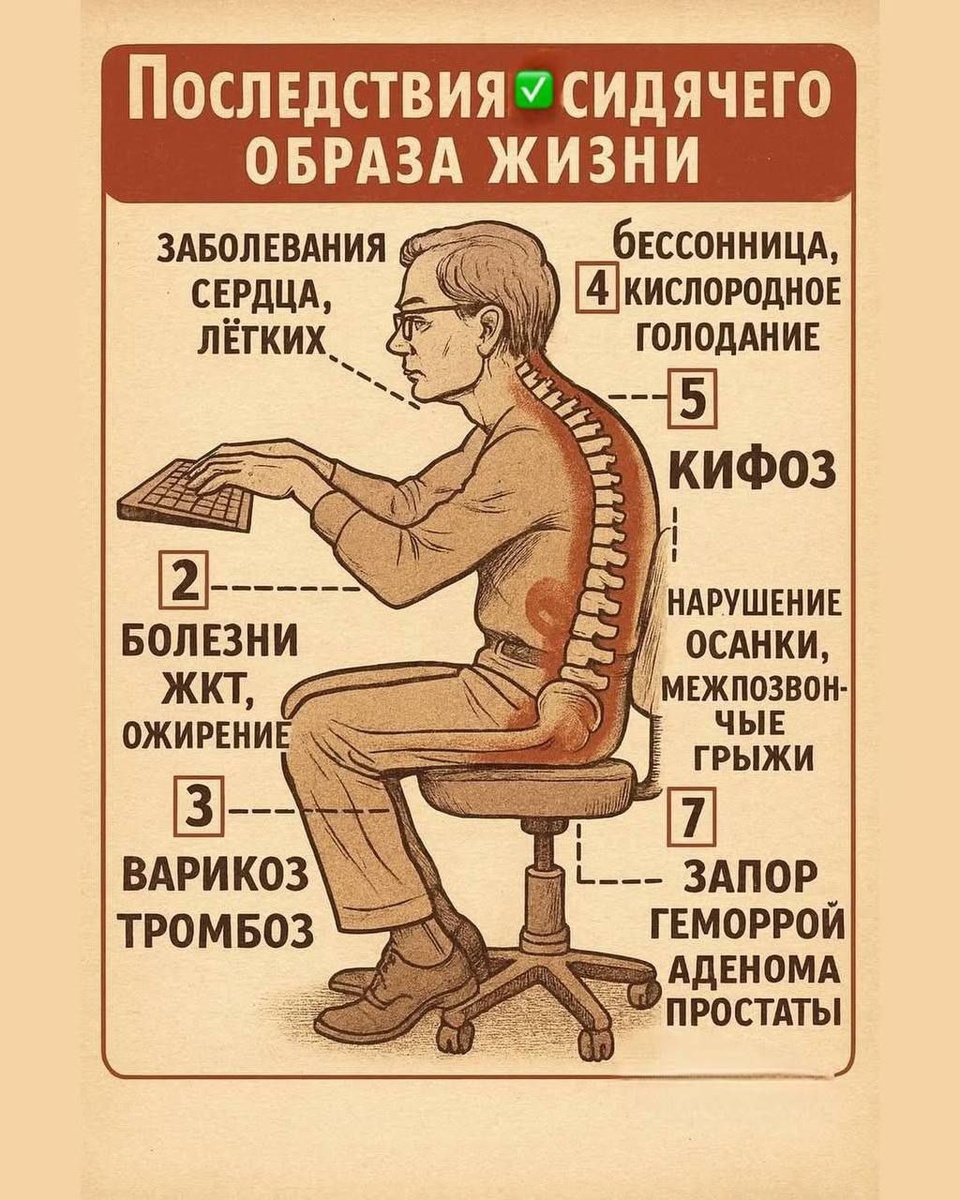 Что происходит с телом при сидячем образе жизни В среднем мы проводим за компьютером по 6-10 часов в день и это постепенно разрушает тело изнутри: • появляются проблемы с сердцем и лёгкими — замедляется кровообращение, повышается риск гипертонии и одышки; • повышается риск ожирения и болезней ЖКТ — снижается обмен веществ, появляется склонность к перееданию; • увеличивается риск варикоза и тромбоза — застой крови в ногах от долгого сидения; • начинается бессонница, кислородное голодание мозга — появляются усталость, снижается концентрация; • страдает осанка — боли, скованность, грыжи и кифоз; • появляются запоры, геморрой, простатит — всё из-за постоянного давления на органы таза. При сидячей работе нужно вставать и разминаться каждые 30-40 минут, делать лёгкую растяжку и постоянно следить за осанкой. Будем здоровы!