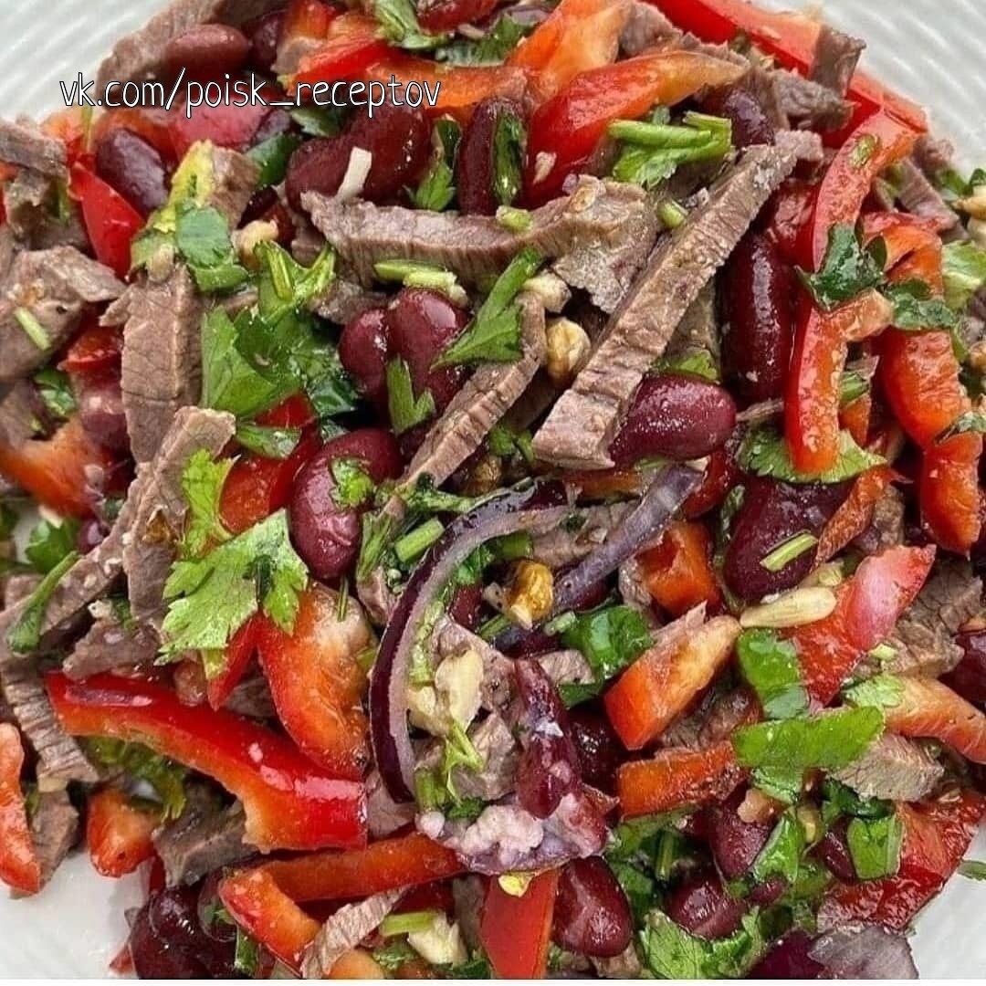 Рецепты Лучшие рецепты тут 👇🏻 ИНГРЕДИЕНТЫ Говядина200 Грамм Фасоль200 Грамм Орехи грецкие 50 Грамм жареные Сладкий красный перец2 Штуки Перец острыйПо вкусу СольПо вкусу Чеснок2 Зубчика Кинза1 Пучок Масло растительное4 Ст. ложки Уксус3 Ст. ложки Красный лук 1 Штука фиолетовый Приготовление: 1. Нарежьте фиолетовый лук тонкими полосками, добавьте уксус и оставьте на 10-15 минут. Отварную говядину нарежьте кубиками или соломкой, отправьте в миску. 2. Соломкой нарежьте красный сладкий перец, по вкусу нарежьте острый красный перец. Жареные грецкие орехи крупно порубите ножом. Чеснок и большой пучок кинзы мелко порубите. 3. Выложите все продукты в миску, с лука слейте уксус и также добавьте в салат. Не забудьте добавить фасоль, растительное масло и соль по вкусу. Перемешайте. Приятного аппетита!
