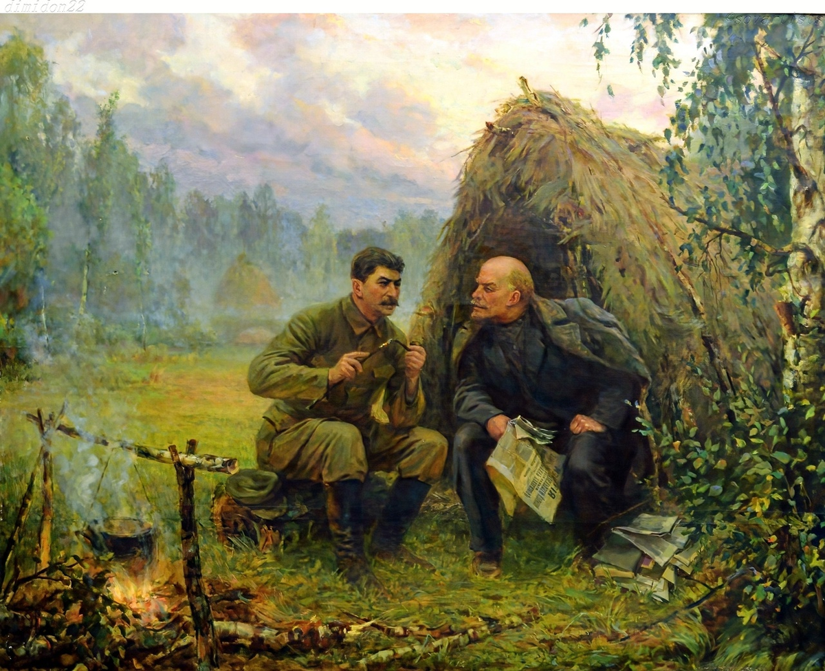 Митюшёв Пантелеймон Михайлович (22.07.1914, Визинга ныне Республики Коми - 30.03.1994, Сыктывкар). «Сталин у Ленина в Разливе». 1949 год. Холст, масло; 124 х 157 см.; (Национальная галерея Республики Коми). Мечтают о Революции в России! А сериале "Хроники русской революции" Ленин на Финляндском вокзале Сталина спрошивал Сталина: "Нас не кокнут?" Чайка Семён Павлович (12.09.1914, д. Новая девица ныне Приморского края - 03.03.1974, Уссурийск). «Свидание». 1950-е гг.; Холст, масло; 90 х 119 см.; (Приморская государственная картинная галерея, Владивосток). А где же баянист? Тюленев Виталий Иванович (28.02.1937, Ленинград - 25.08.1997, С-Пб). «Чудак». 1975 год. Холст, масло; 122 х98 см.; (Красноярский художественный музей имени В.И. Сурикова). Точно, чудак! Но такой соцреализм нам не нужен. Петухов Иван Сергеевич (03.03.1922, д. Колечье ныне Смоленской области - 1993, Хабаровск). «Доярки». 1978 год. Холст, масло; 153 х 210 см.; (Музей современного искусства ЕАО, Биробиджан). Вот настоящий