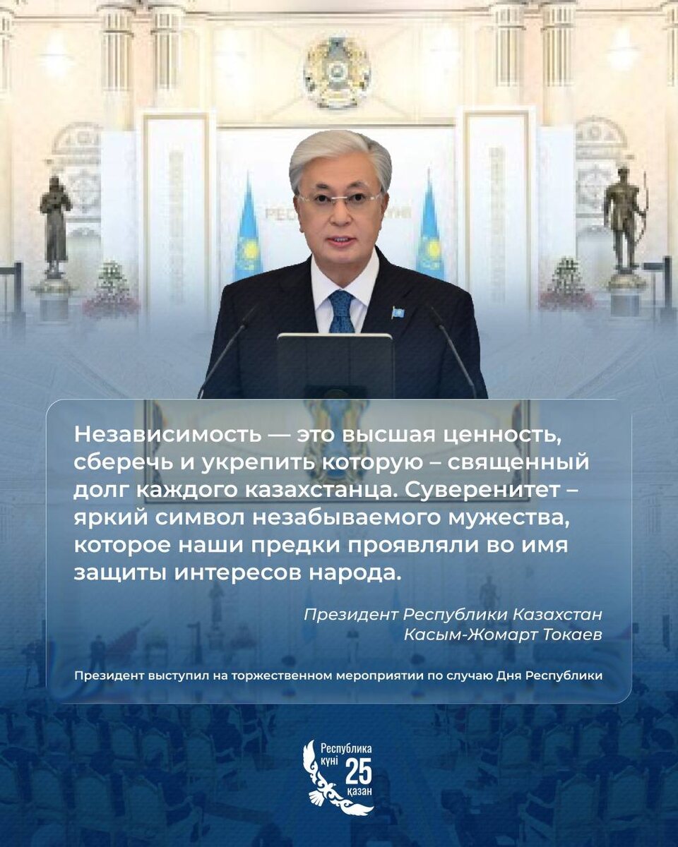 ✨ Из выступления Главы государства Касым-Жомарта Токаева на торжественном мероприятии по случаю Дня Республики ✍️ Источник Akorda.kz 🌐avestnik.kz #ДеньРеспублики #Казахстан #Независимость #Токаев #Праздник