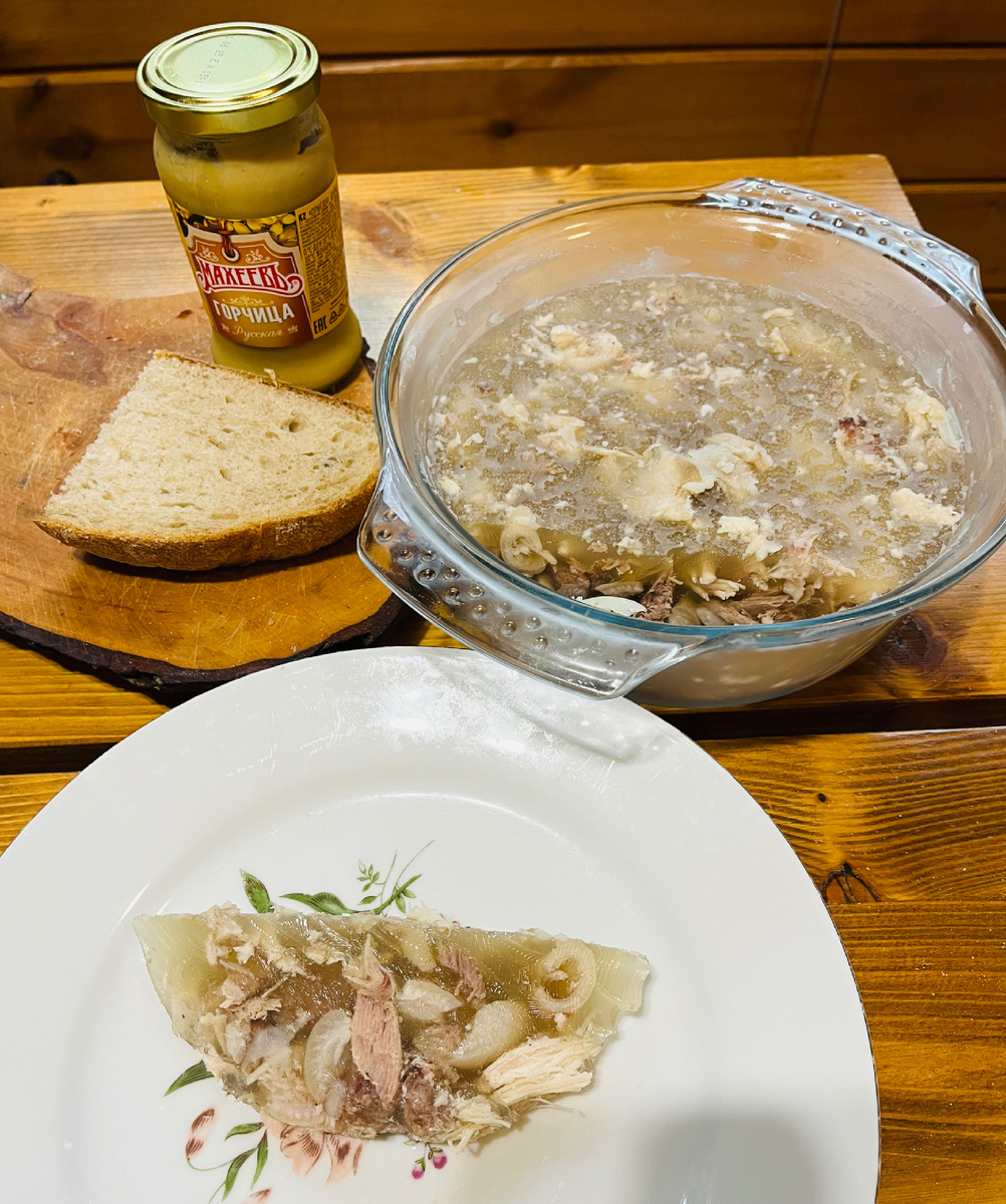 Дома в холодильнике был куриный окорочок и мякоть говядины, позже вечером сварила из трех компонентов. Застыл очень хорошо!