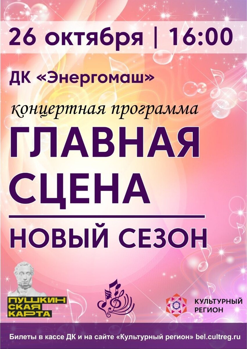 26 октября 2025 года в 16:00 «Главная сцена. Новый сезон» Уважаемые белгородцы! Мы рады пригласить вас на уникальное событие — концерт-открытие нового творческого сезона, который пройдет в стенах нашего любимого дворца культуры «Энергомаш». Этот вечер станет настоящим праздником, наполненным яркими эмоциями, прекрасными музыкальными композициями и незабываемыми впечатлениями. Вас ждут выступления талантливых коллективов, любимые номера и премьерные постановки, созданные специально для открытия сезона. Мы подготовили для вас насыщенную программу, которая подарит вам вдохновение и зарядит позитивом на весь следующий творческий год. Мы ждем всех любителей прекрасного, ценителей искусства и тех, кто хочет провести вечер в атмосфере праздника и радости. Начало концерта: 26 октября 2025 года в 16:00. Адрес: Дворец культуры «Энергомаш», проспект Богдана Хмельницкого 78б Билеты тут👇 и в кассе ДК. https://bel.cultreg.ru/events/534037/koncert-otkrytie-tvorcheskogo-sezona