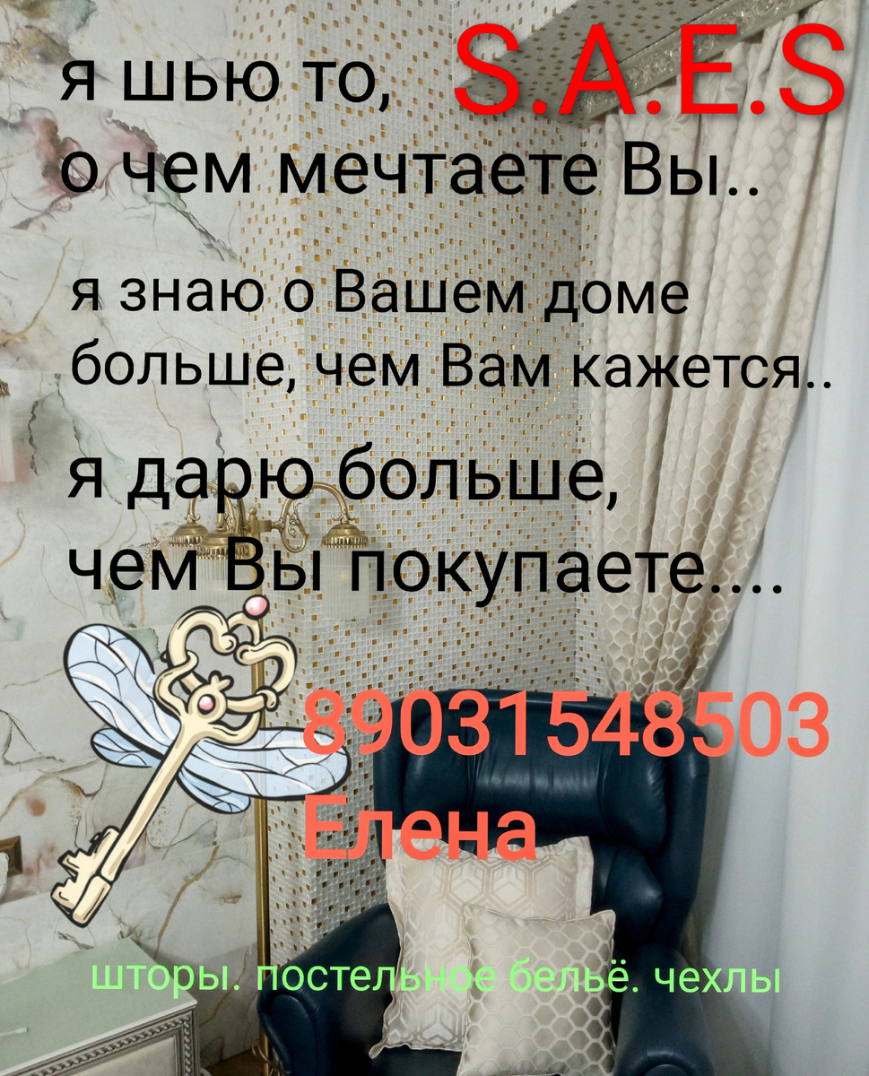 Дорогие друзья ,рада приветствовать Вас на канале творческой мастерской "S.A.E.S". Меня зовут Елена и я реализую проект своей мечты -семейная мастерская по изготовлению текстиля для дома любой сложности! Почему мастерская,а не ателье или салон?Потому что это совершено разные вещи!Алгоритм моей работы совершенно другой,основанный на общении с Вами,удовлетворяющий Ваши индивидуальные ! запросы,закрывающий Ваши потребности !Мы выбираем ,создаём и придумываем вещи ,которые будут особенными,уникальными ,с Вашей энергетикой и настроением, только для Вашего личного пространства !Поэтому в моей работе много,очень много,ручного труда,живого общения,человеческого тепла и творчества ! Почему семейная?Потому что семья -это главное! Традиции в семье -это корни дающие уверенность в завтрашнем дне!Дело созданное с любовью, становится не просто источником дохода,а философией объединяющей поколения! Я не шью на маркетплейсы,ТК мне важно качество .Ко мне нельзя придти как в магазин и купить готовую ве