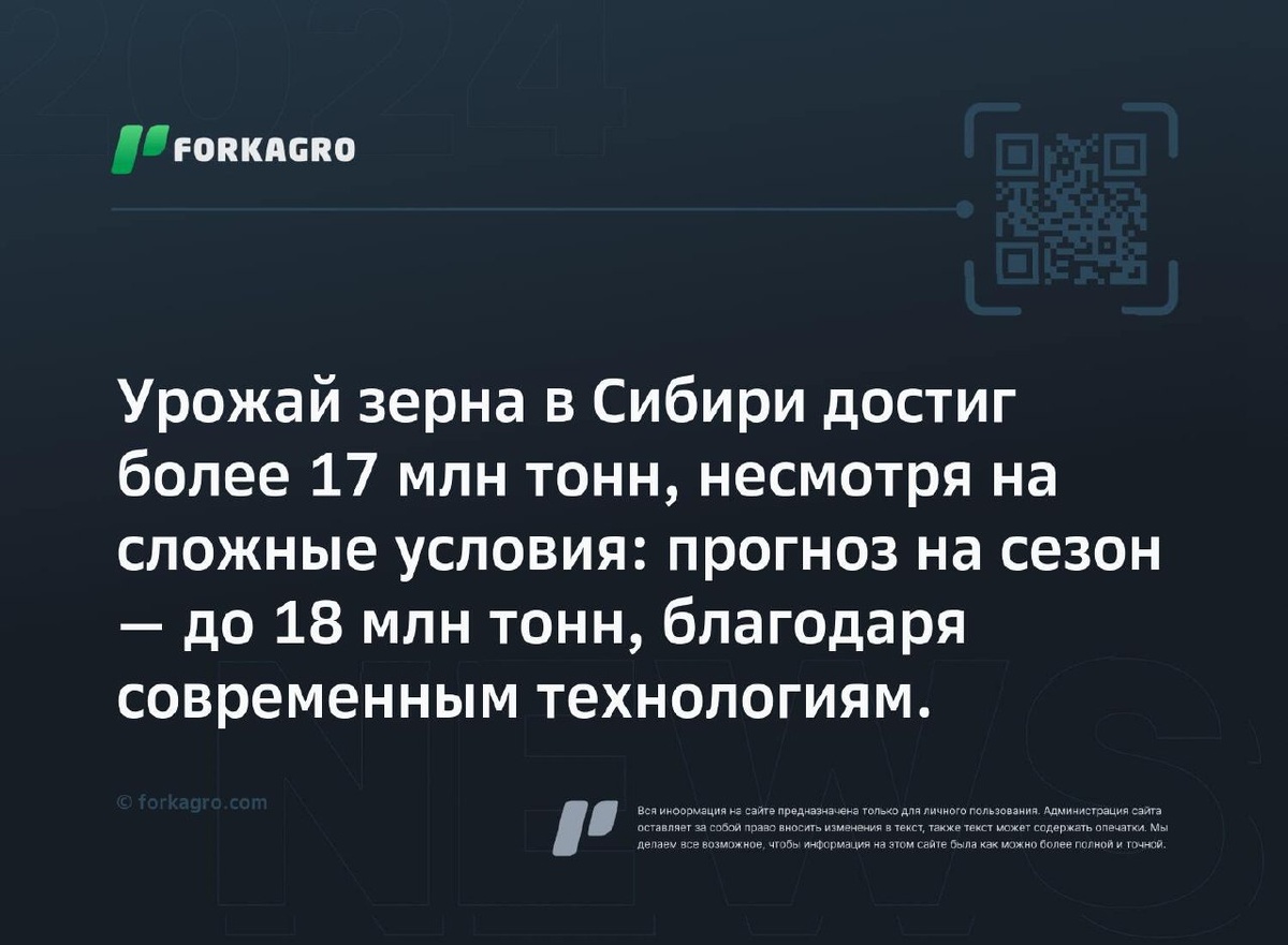 Урожай зерна в Сибири достиг более 17 млн тонн, несмотря на сложные условия: прогноз на сезон — до 18 млн тонн, благодаря современным технологиям. В Сибири урожай зерна достиг уже более 17 млн тонн, превысив прошлогодний показатель. Вследствие избыточных осадков уборка затруднена, но благодаря увеличению сушильных установок удалось сохранить значительную часть урожая. Прогнозируется рост производства зерновых и масличных культур до 18 и 5 млн тонн соответственно. Перейти к источнику