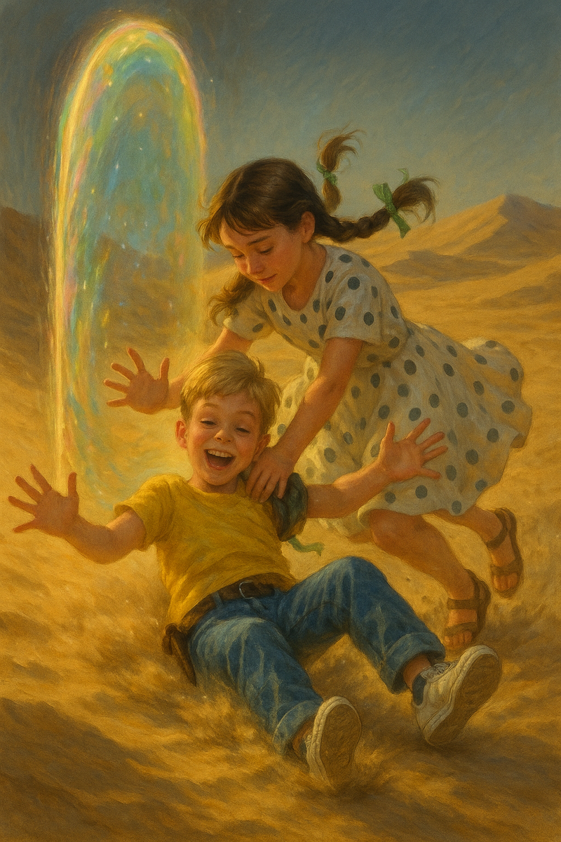 Он огляделся. Перед ними раскинулась пустыня. До самого горизонта - песок, искрящийся под палящим солнцем. Воздух дрожал от жары, сухой ветер гнал редкие пылевые струи, оставляя на барханах узорчатые следы. Никакой растительности, никакой тени - только раскалённый песок и небо, слепящее светом.