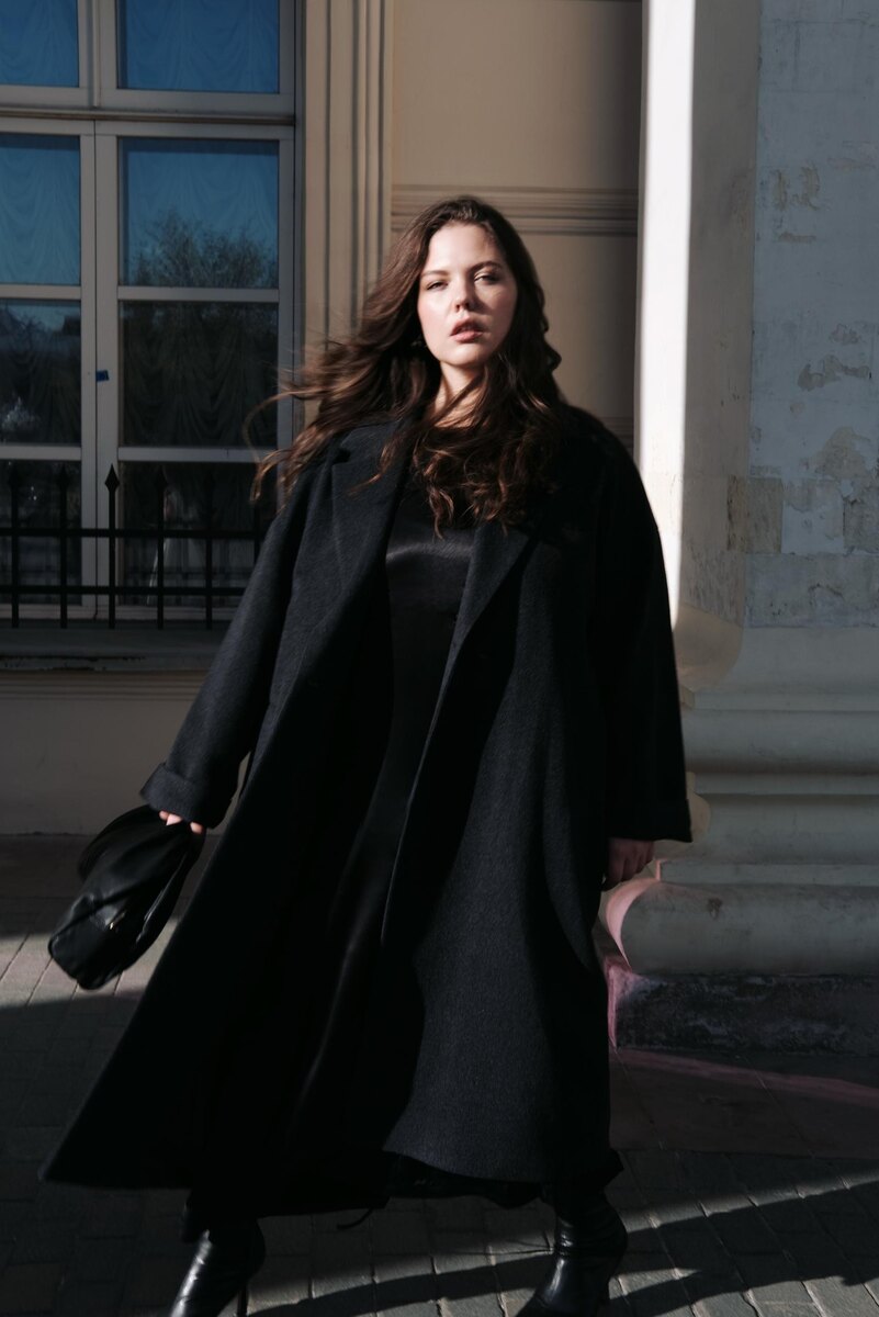 Дивная Саша для прогулки по Москве выбрала графитовое пальто‑халат из шерсти и шелка и платье из блестящей вискозы