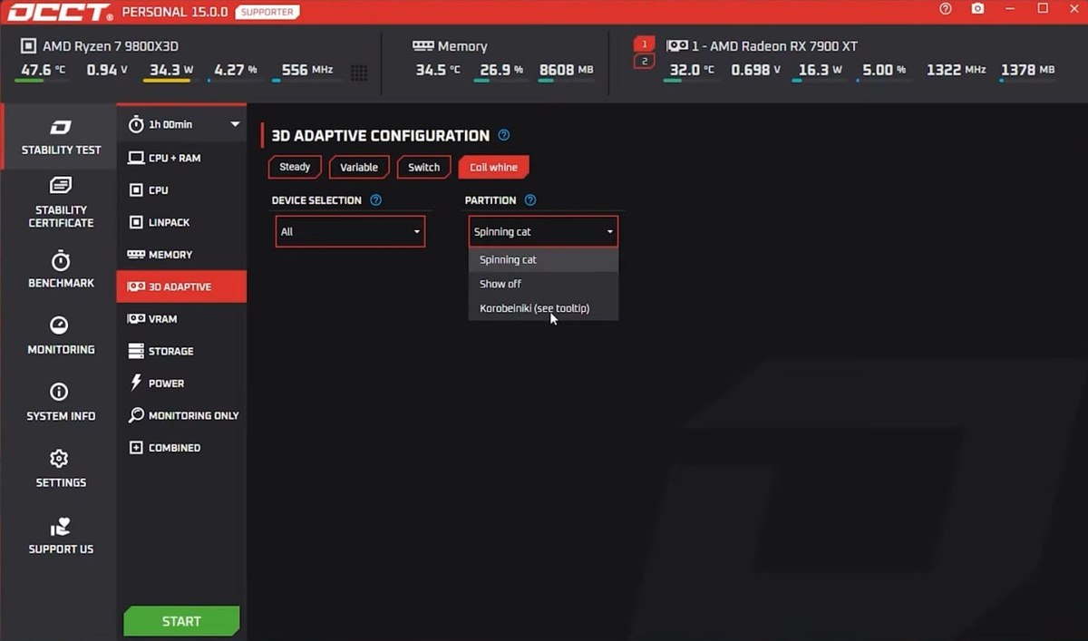 OCCT 15 получил необычное обновление: теперь, кроме всего прочего, тест 3D Adaptive умеет «обнаруживать свист катушек» на видеокартах и даже воспроизводить его как «мелодию». На старте доступны три мелодии, позже обещают добавить пользовательские.