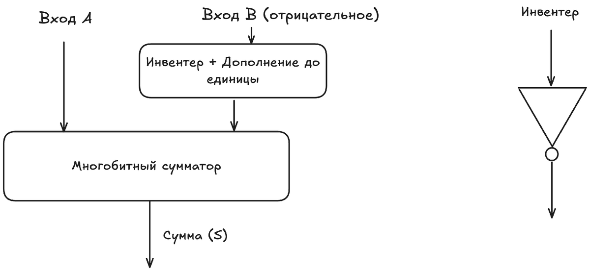 Мы уже научили компьютер складывать числа при помощи многобитного сумматора. Но этого явно недостаточно, ведь любая реальная задача требует не только сложения, но и вычитания. На первый взгляд кажется, что нужно построить ещё одно устройство — «вычитатель». Но инженеры пошли умнее: оказалось, что вычитание можно выполнить с помощью тех же сумматоров, просто по-другому представив числа.