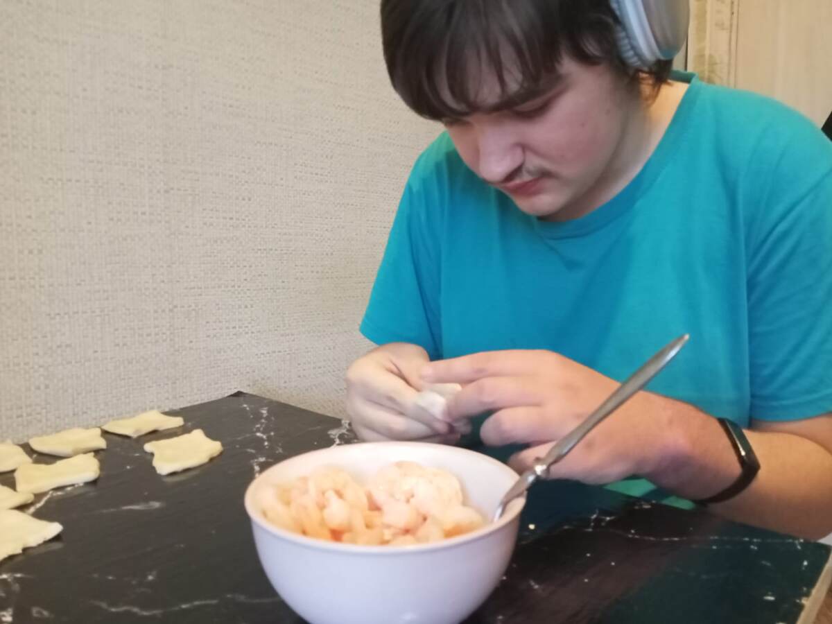 Это Гриша лепил пирожки с креветками))) сам придумал, сам слепил. Есть не смог. Родители были счастливы. Пирожки с креветками. МММММ.