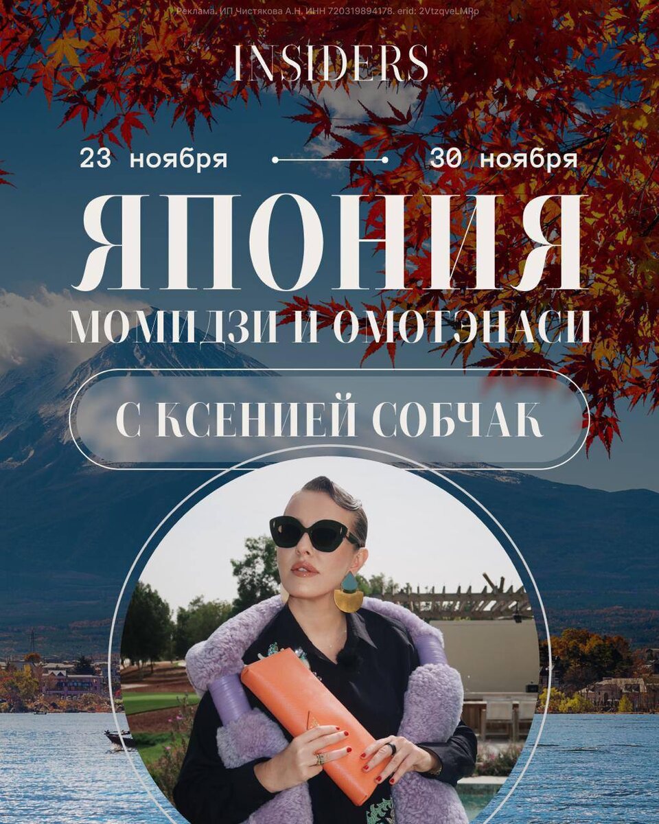 Поэтому поехать смотреть на красные клены в компании Ксении Собчак - звучит как отличный план на конец ноября – благо визы в Японию делаются за пару дней и бесплатно. Программа INSIDERS тоже отличная: и наш любимый модный район Токио – Аояма – ,и Сад Философов в Киото.