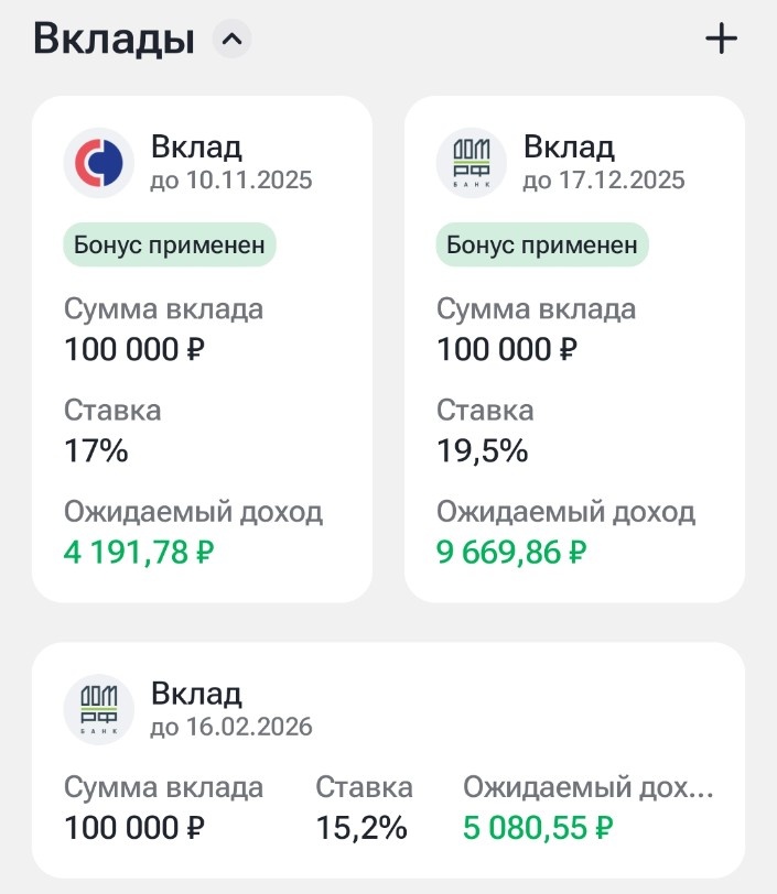 Вот уже больше года я пользуюсь Финуслугами, ну и в основном, конечно, для кредитных средств. Хвала тем банкам, которые еще не закрыли эту возможность. А как страшно-то по-началу было! Сейчас у меня через Финуслуги открыто три вклада. Зачем они мне нужны? Ну, во-первых, чтобы Финуслуги на меня не обижались. Завела деньги - надо пользоваться услугами платформы. Во-вторых, мне нужен доступ в ДомРФ банк, а их карты у меня нет. И вряд ли будет, в связи с предстоящим ограничением их количества. Но там хороший накопительный счет со стабильно высокими процентами на ежедневный остаток - сейчас 16%. Поэтому, после окончания вклада, открываю там новый. В-третьих, на Финуслугах бывает, что банки предлагают хорошие ставки, добавление % по промокодам, и бонусы за выполнение задания. За бонусы тоже можно купить промокод на дополнительный % по вкладу. Сейчас у меня два вклада в ДомРФ банке по срокам пересекаются. Надо было убить несколько зайцев: и операцию какую-нибудь провести, и задание вы