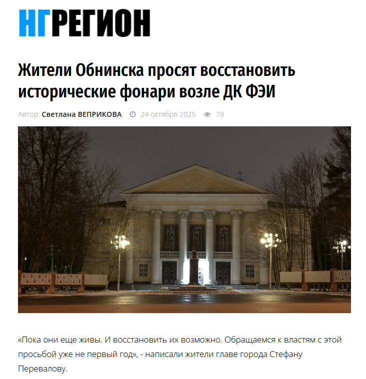 Жители Обнинска просят восстановить исторические ли❓ фонари возле ДК ФЭИ