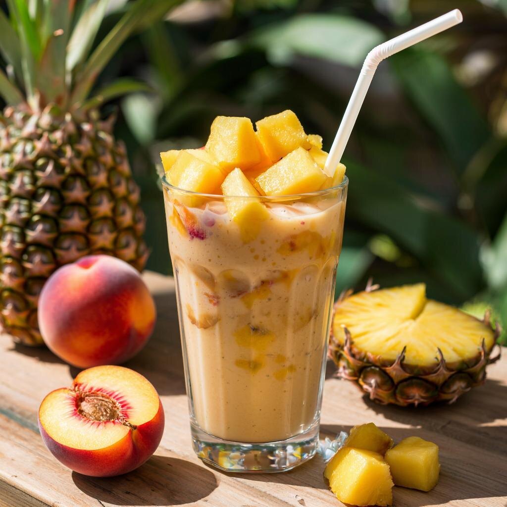 Вот десять вкусных вариаций смузи с персиками и ананасами: Вариант №1: Классический фруктовый Ингредиенты: - Спелые персики – 2 шт. - Свежий ананас – 1 стакан нарезанных кусочков - Натуральный йогурт – ½ стакана - Мед – 1 ст.л. (по вкусу) - Кубики льда – 4-5 шт. Приготовление: Взбейте все ингредиенты вместе до гладкой консистенции. Вариант №2: Со шпинатом Ингредиенты: - Персик – 1 шт. - Ананас – ¾ стакана нарезанного - Шпинат – горсть листьев - Миндальное молоко – ¼ стакана - Ягоды малины – горсть (замороженные или свежие) - Льняное семя – 1 ч.л. Приготовление: Смешайте все компоненты, хорошо перемешивая до кремообразной массы. Вариант №3: Кокосово-мятный Ингредиенты: - Персики – 1 шт., очищенный и нарезанный - Ананас – 1 чашка нарезанного - Кусочек свежего кокоса (или кокосовая вода) – ⅓ стакана - Листья свежей мяты – несколько веточек - Столовая ложка меда - Лед – по желанию Приготовление: Перемешайте все продукты в блендере до гладкости. Вариант №4: Шоколадный фреш Ин