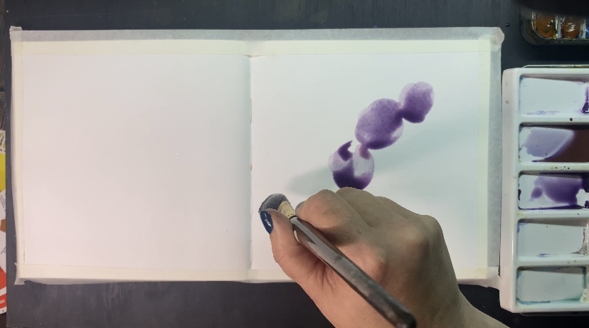 Создаем легкий и воздушный акварельный разворот в альбоме, передаем объем, нежность и глубину пространства осенних цветов. Материалы: альбом с акварельной бумагой Акварельные краски: Ультрамарин, Розовый хинакридон (или аналогичный розовый/лиловый), Лимонная желтая. · Кисти: средняя (№4-6 круглая) для цветов, тонкая (№1-2 круглая) для деталей. · Вода в двух емкостях (в одной вода должна быть чистой) · Палитра для смешивания или белое блюдце. · Бумажные салфетки для снятия лишней влаги. Вспоминаем правило золотого сечения. Мысленно разделите лист на три части по горизонтали и вертикали. Главные, самые крупные и яркие цветы лучше расположить не в центре, а ближе к точкам пересечения этих линий. Мы сделаем это в правой трети. Это сделает композицию динамичной и интересной. Смешиваем ультрамарин и розовый хинакридон чтобы получить фиолетовый. На палитре смешайте две краски в разных пропорциях, чтобы получить разнообразие оттенков: от холодного сиреневого до глубокого фиолетового. Обр