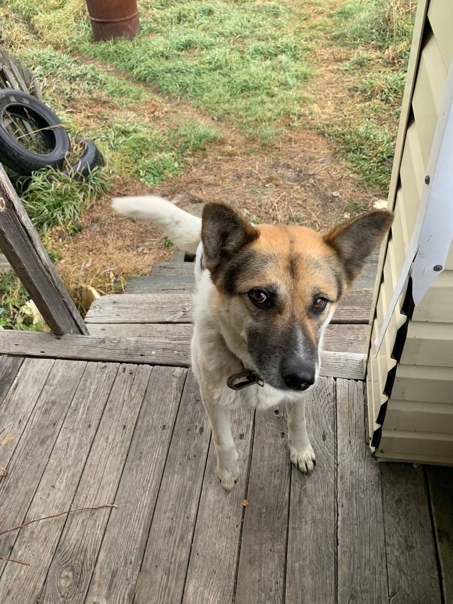 Помните нашу скромную девочку из приюта? Теперь у неё свой крыльцо-пост охраны, свой человек и миска. По словам семьи, «всё в порядке: весёлая, бодрая, кушает хорошо» — хвост виляет и глаза светятся.