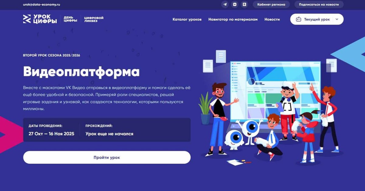С 27 октября по 16 ноября VK проведет новый этап всероссийского проекта «Урок цифры» на тему «Видеоплатформа». Школьники узнают, как устроен современный сервис хранения и распространения видео на примере крупнейшей платформы VK Видео.