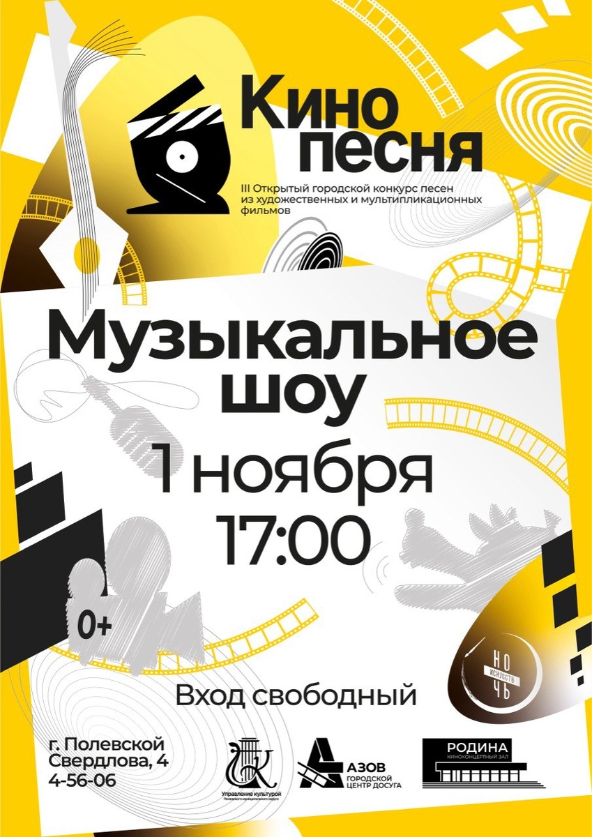Музыкальное шоу для всех любителей кино 1 ноября в городском центре досуга «Азов» пройдёт Гала-концерт с участием победителей и лауреатов III открытого городского конкурса песен из художественных и мультипликационных фильмов «Кинопесня». Готовы погрузиться в атмосферу незабываемых кинохитов, которые когда-то заставили ваше сердце биться чаще? Не упустите возможность насладиться потрясающими голосами и атмосферой настоящего праздника музыки! Начало в 17:00. Вход свободный.