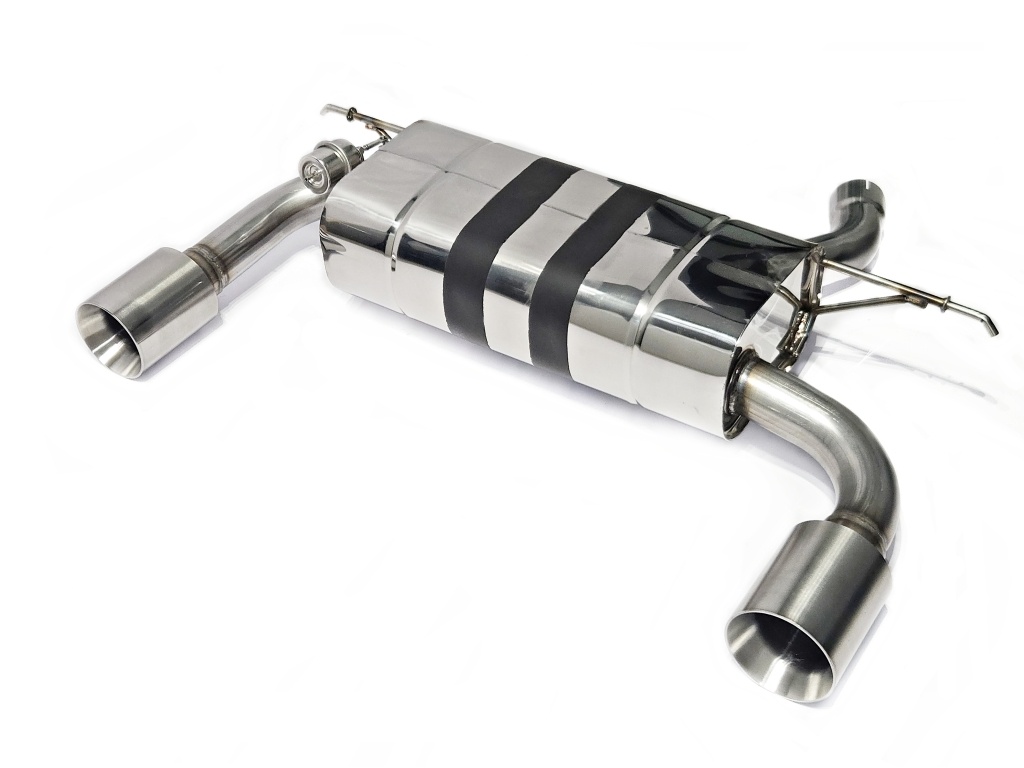 Задняя часть выхлопной системы для семейства автомобилей BMW 3-й серии 318i (F30, 31 рестайлинг) с двигателем B38B15 1.6 л, 136 л.с. Двухрежимный глушитель (с заслонкой) и насадки серии Performance. Глушитель имеет громкий и тихий режим ,выполнен полностью из нержавеющей стали AISI 304, в том числе и внутренняя, цельная перфорированная труба. Насадки выхлопной системы диаметром 100 мм, выполнены так же полностью из нержавеющей стали AISI 304. (Глушитель может быть укомплектован насадками меньшего или большего диаметра - по желанию). Патрубки - AISI 409. Двухрежимный глушитель позволяет переключать с помощью нажатия кнопки режимы громкости: