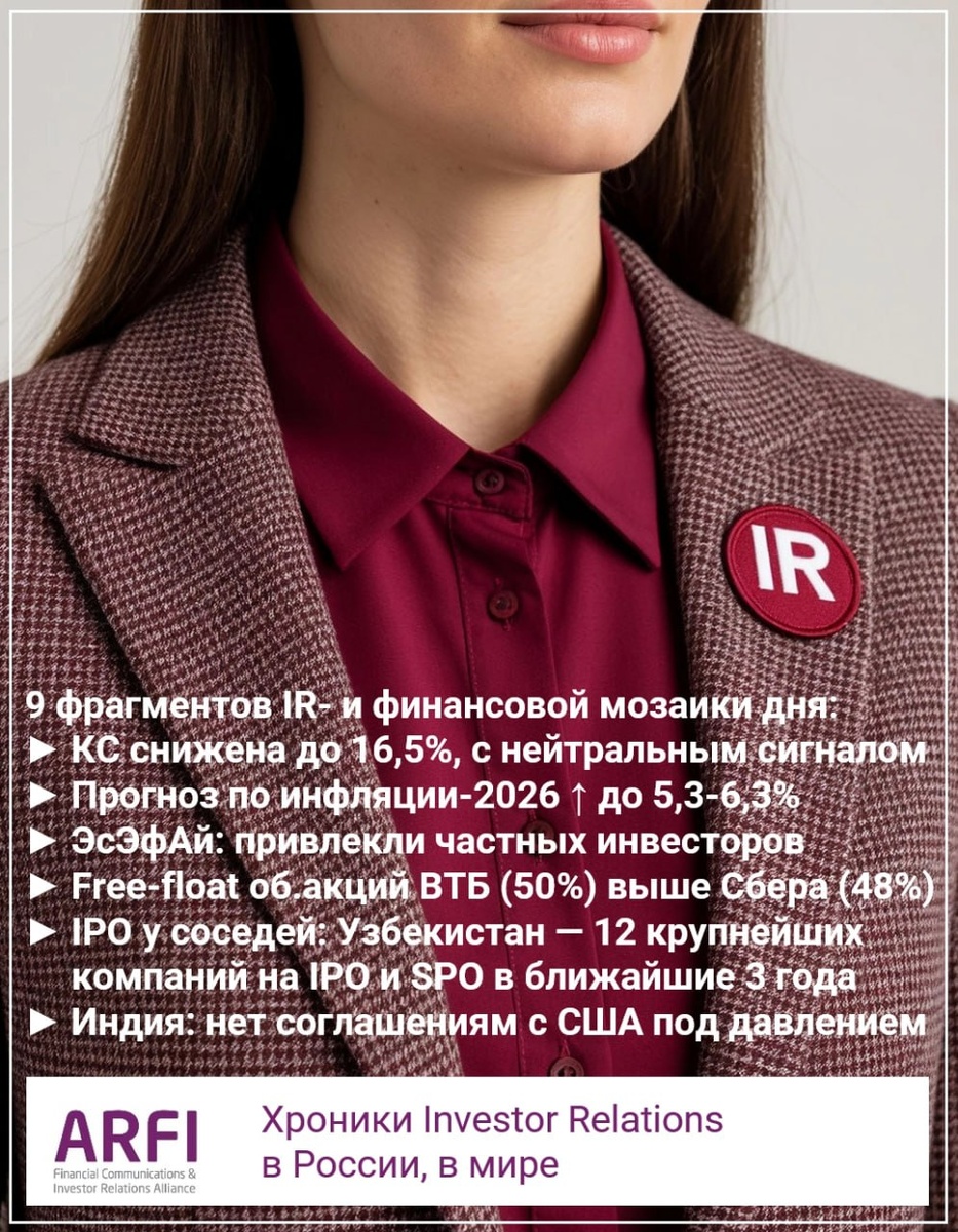 Утренний IR-дайджест 25.10.2025 Формирование условий для следующей волны IPO (продолжение снижения КС до конца 2025 года?) ► Совет директоров Банка России 24 октября принял решение снизить ключевую ставку на 50 б.п., до 16,5% годовых. • ЦБ повысил прогноз по инфляции на 2026 год с 4,6-5,1% до 5,3-6,3% в связи с действием разовых проинфляционных факторов. • Нет выраженной тенденции к снижению устойчивой инфляции. С прошлого заседания реализовались существенные инфляционные риски. Это прежде всего увеличение дефицита бюджета в этом году и рост стоимости моторного топлива. • Устойчивые показатели текущего роста цен значимо не изменились и остаются выше 4% в пересчете на год. • Экономика продолжает возвращаться к траектории сбалансированного роста. • В последние месяцы активизировался рост кредитования. • Высокими остаются инфляционные ожидания. (Смартлаб) ► Эльвира Набиуллина, председатель ЦБ РФ: • В декабре можем либо снизить, либо сохранить ставку, сигнал нейтральный. • Рассматривали