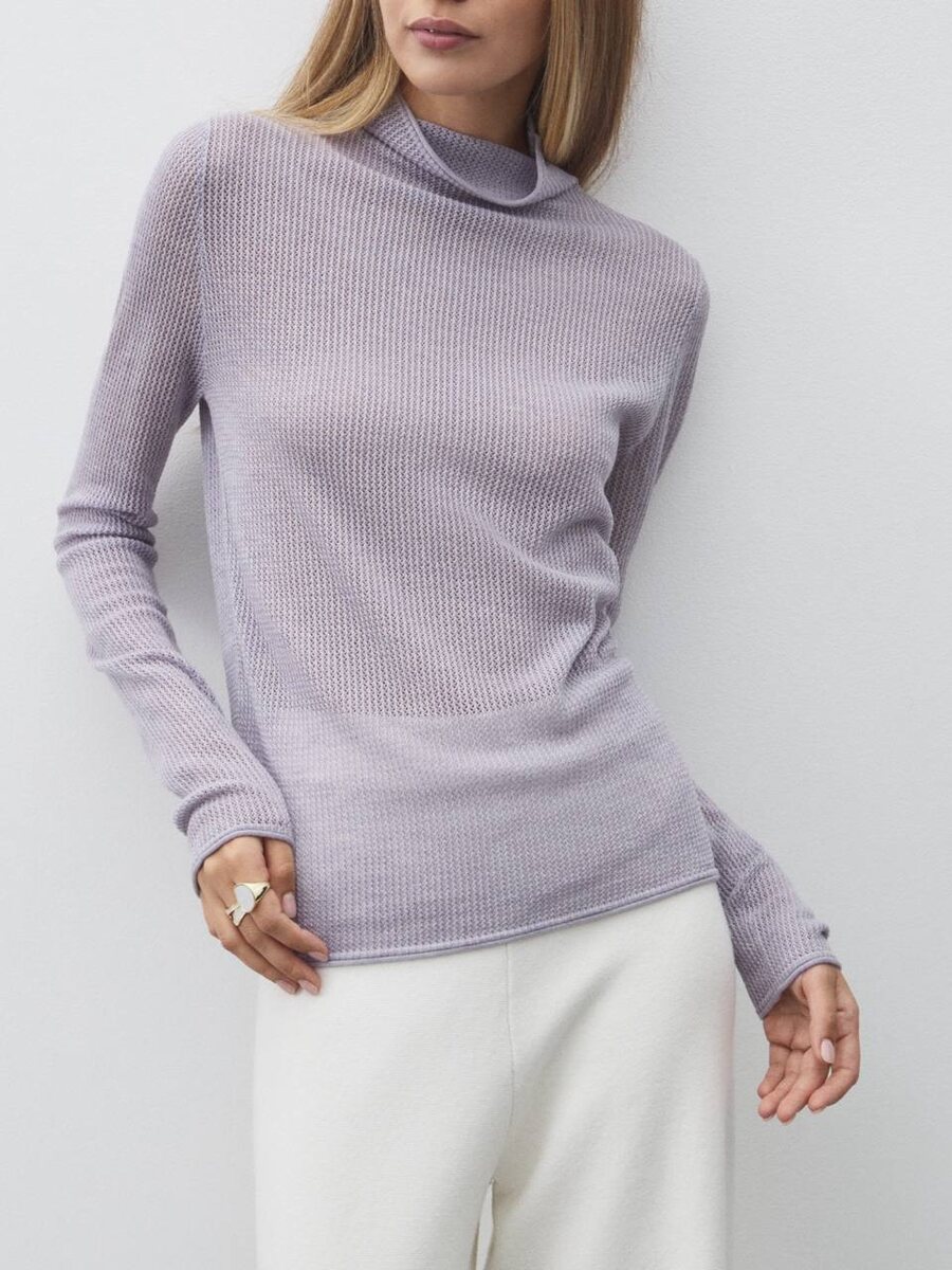Выбор Елизаветы — лавандовый джемпер, выполненный в технике кроше, и прямые джинсы Maison David, образ дополняют казаки Tendance из мягкой кожи