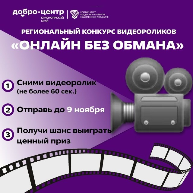 Стартовал региональный конкурс социальных видеороликов «Онлайн без обмана». Конкурс призван повысить осведомленность жителей края о методах защиты от мошеннических действий в цифровом пространстве. 📌 Участниками конкурса могут стать граждане Красноярского края с возраста 18 лет, зарегистрировавшиеся на добровольческой платформе Добро.РФ. 📌 Категории конкурса: • «Цифровой щит-ДЕТИ» (целевая аудитория: до 18 лет); • «Это может случиться с каждым!» (целевая аудитория: от 18 лет до 55 лет); • «Безопасный клик» (целевая аудитория: 55 лет и старше). 📌 Приём работ: по 9 ноября. 📌 Итоги конкурса: до 30 ноября. Подробнее по ссылке 🏆Авторы лучших видеороликов получат ценные призы.