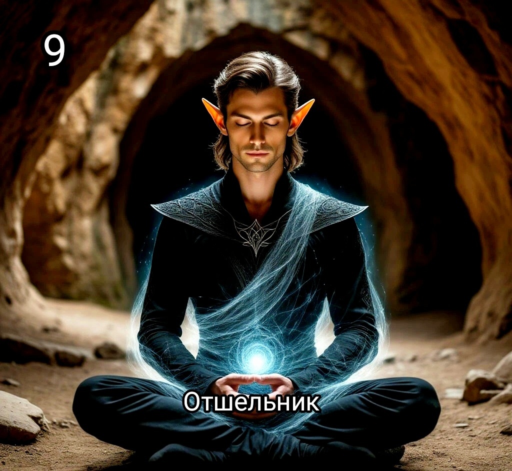 В колоде Таро аркан Отшельник воплощает стремление, намерение и идею погружения в глубины собственного Я, исследования сокровенного, стремления к саморазвитию,к внутренней гармонии и осмысление собственного пути в поиске ответа на вопрос : КТО Я... Отшельник предстаёт перед нами, как символ мудрости, переосмысления ценностей ,с помощью проведения самоанализа в расстановки приоритетов во всех сферах жизни, путём социальной изоляции и ограничения общения ума, вплоть до тишины ума с помощью медитаций( динамичных- цигун, статичных - различные медитативные практики в неподвижной позе: дзен, египетская медитация, поза лёжа). Аркан Отшельник подчёркивает, что только в тишине и спокойствии можно найти ответы на волнующие вопросы , вплоть до Просветления...