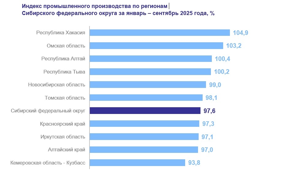 Индекс промышленного производства среди регионов Сибирского федерального округа в январе – сентябре 2025 года по сравнению с аналогичным периодом 2024 года варьировал от 104,9% в Республике Хакасия до 93,8% в Кемеровской области – Кузбассе. В целом по округу этот показатель составил 97,6%. По информации Новосибирскстата, в Новосибирской области индекс промышленного производства в январе – сентябре 2025 года достиг 99% по сравнению с тем же периодом 2024 года. При расчете индекса учитывается динамика выпуска продукции и оказания услуг в сырьевом секторе, обрабатывающих отраслях, тепло- и электроэнергетике, а также в сферах водоснабжения и водоотведения, утилизации отходов и ликвидации загрязнений. Рост объемов производства в Новосибирской области зафиксирован в двух секторах: в добыче полезных ископаемых – на 5,2%, в энергетическом секторе, тепло- и газоснабжении – на 0,4%. Снижение производства наблюдалось в обрабатывающих отраслях на 1,8%, а также в сферах водоснабжения и водоотведени