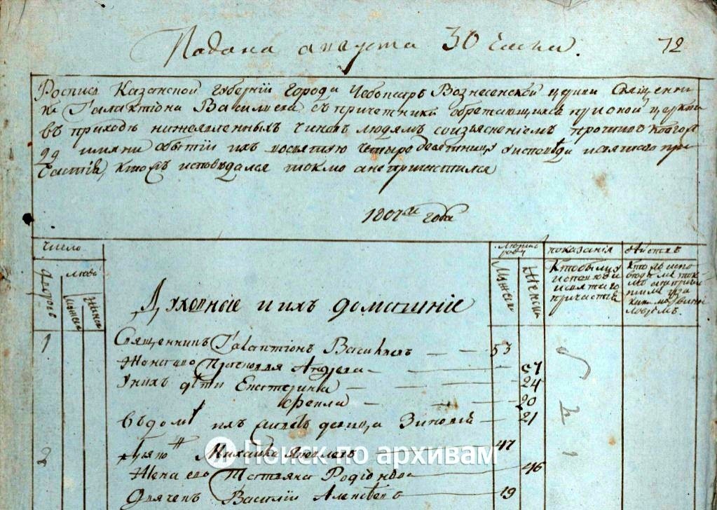 Роспись Казанской губернии города Чебоксар Вознесенской церкви священника Галактиона Васильева с причетники обретающихся при оной церкви в приходе нижеявленных чинов людям со изъяснением против коегождо имени о бытии их в святую Четыредесятницу у исповеди и святого причастия, кто ж исповедался токмо, а не причастился.