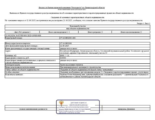 Название: Земельный участок с кадастровым номером 47:26:0802001:604 площадь 1000 по адресу Российская Федерация, Ленинградская область