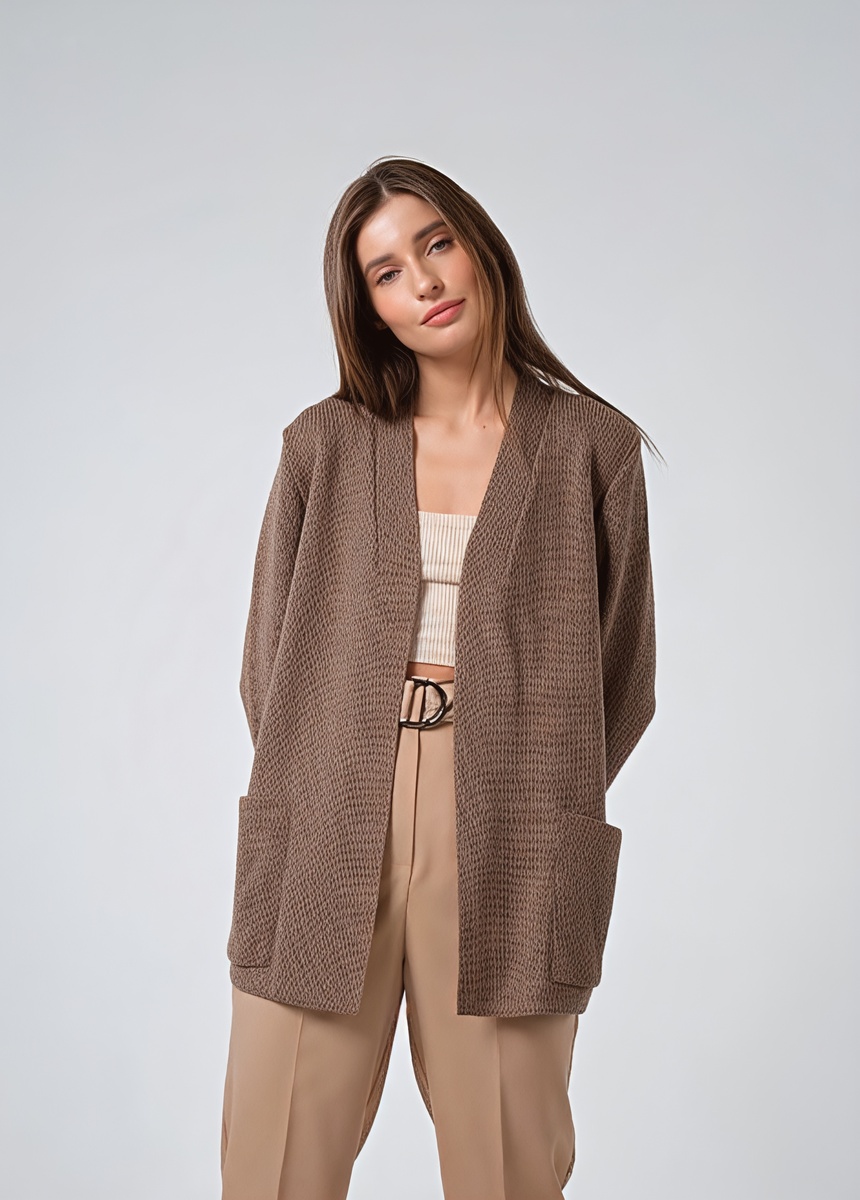 Этой осенью особенно актуальны фактурные материалы. Букле с мягкой текстурой, трикотаж крупной вязки, плотная шерсть с небольшим ворсом. Эти ткани не только выглядят благородно, но и создают интересную игру фактур в образе.