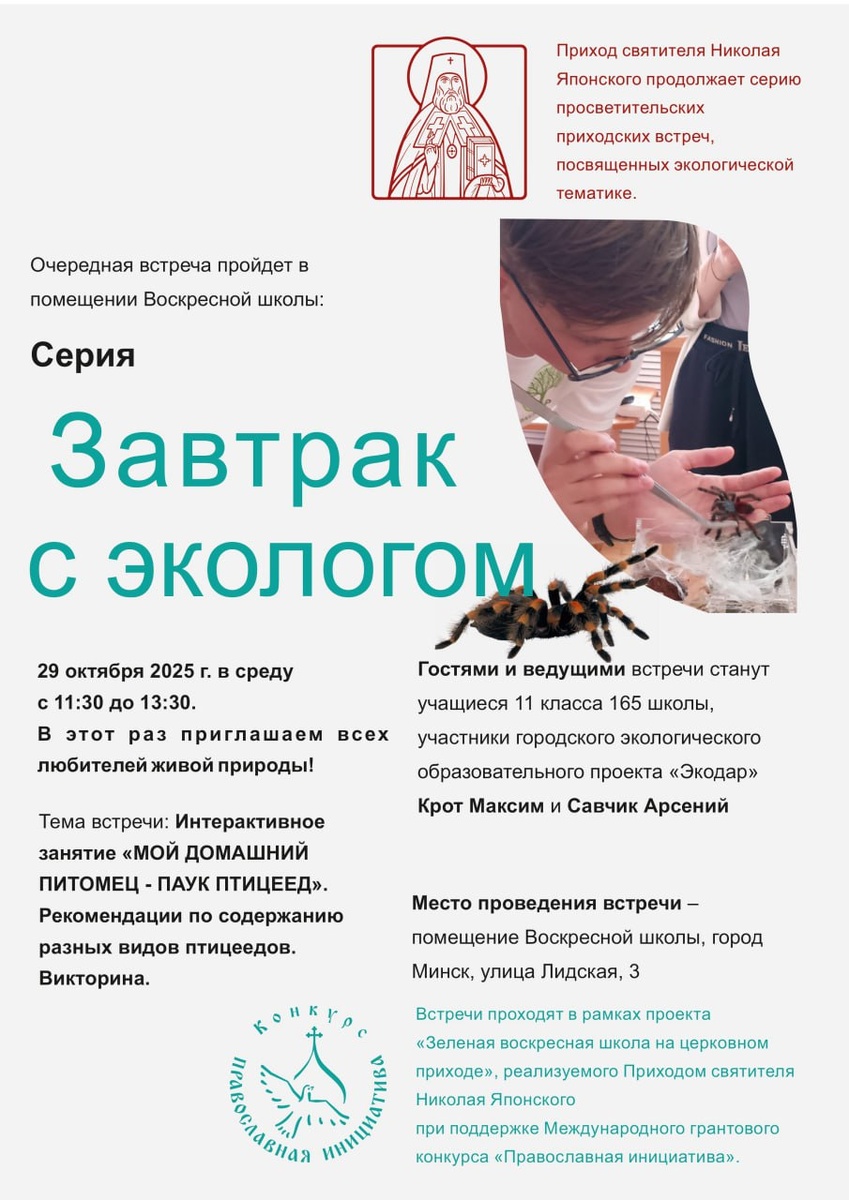 Приход святителя Николая Японского продолжает серию просветительских приходских встреч «Завтрак с экологом», посвященных экологической тематике. Каждая встреча будет посвящена определенной экологической теме. Очередная встреча пройдет в помещении Воскресной школы: 29 октября 2025 г. в среду с 11:30 до 13:30. Тема встречи: Интерактивное занятие «МОЙ ДОМАШНИЙ ПИТОМЕЦ — ПАУК ПТИЦЕЕД». Рекомендации по содержанию разных видов птицеедов. Викторина. Гостями и ведущими встречи станут учащиеся 11 класса 165 школы, участники городского экологического образовательного проекта «Экодар» Крот Максим и Савчик Арсений. Место проведения встречи – помещение Воскресной школы, город Минск, улица Лидская, 3 Встречи проходят в рамках проекта «Зеленая воскресная школа на церковном приходе», реализуемого Приходом святителя Николая Японского при поддержке Международного грантового конкурса «Православная инициатива».