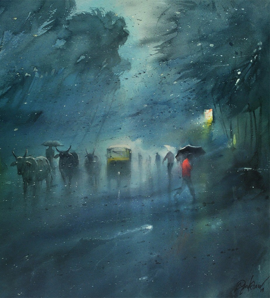 Вдохновение для моих работ я черпаю в моментах «повседневной жизни» в Индии. Это действительно прекрасно: когда идёшь по улицам, видишь придорожные лавки, собак и коров, которые делят улицы с людьми. Обычно я запечатлеваю свет, который падает на улицы и людей на них, будь то лето или сезон муссонных дождей. Для художника это фантастическое зрелище.