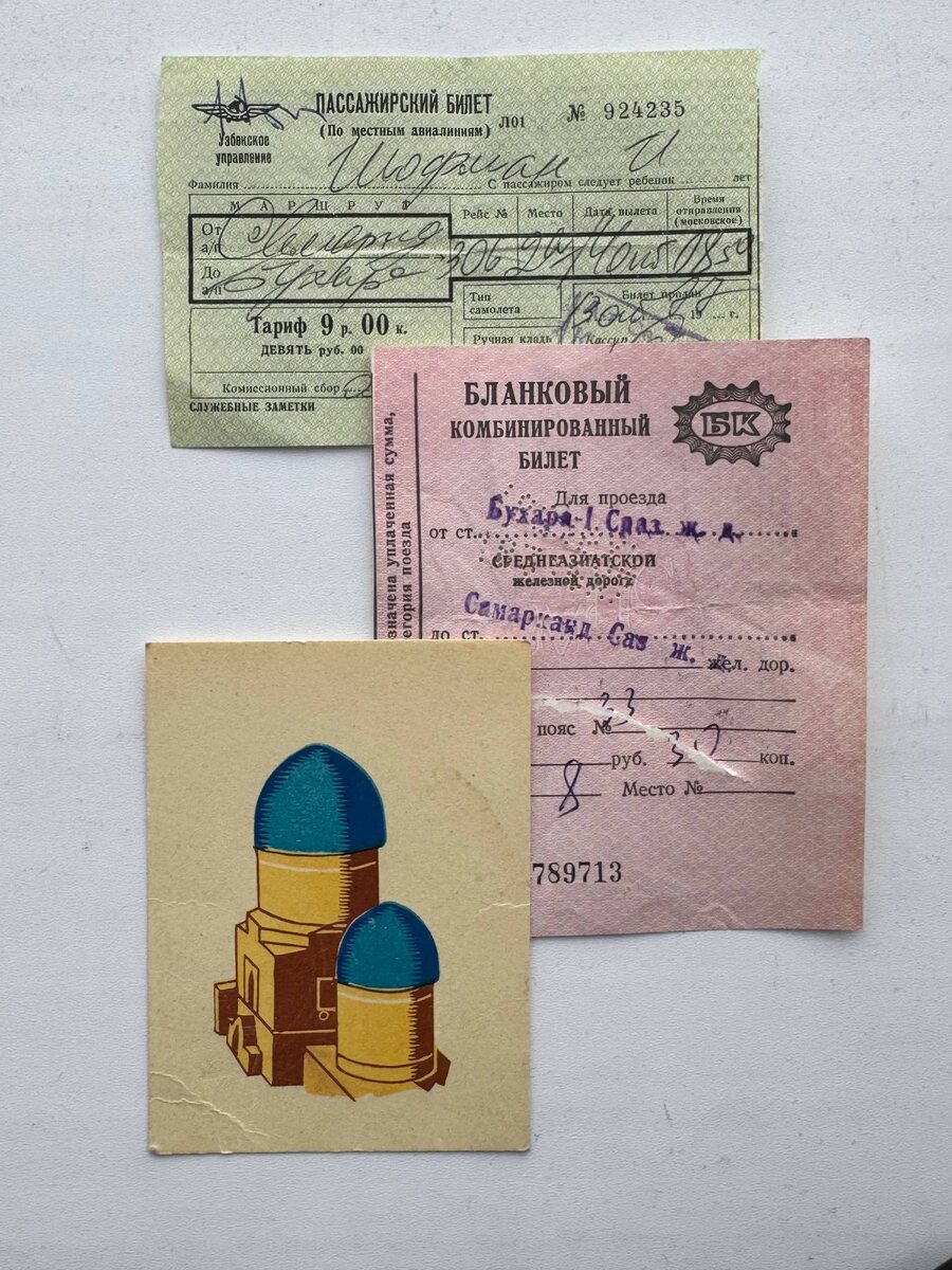 Случайная находка в путеводителе по Самарканду: маленький бумажный памятник тому, как в середине 1970-х годов некий И. Шофман путешествовал из Бухары в Самарканд и из Самарканда в Бухару. Из Бухары в Самарканд он ехал по Среднеазиатской железной дороге, что стоило 6 рублей 30 копеек, а из Самарканда в Бухару летел на самолёте, что стоило 9 рублей плюс 30 копеек комиссионного сбора. А на память прихватил с собой открытку, на обороте которой написано «Самарканднинг 2500 йиллиги», что переводится как «Самарканду 2500 лет». Автор изображения на открытке Александр Визель, ученик Фаворского (это чувствуется). И бонусом сама книга: оформил ее так как красиво легендарный Соломон Телингатер (тоже, кстати, ученик Фаворского: он преподавал ему во ВХУТЕМАСе). И это, как я понимаю, была одна из последних подготовленных им книг, потому что его имя в выходных данных обведено прямоугольной рамкой.
