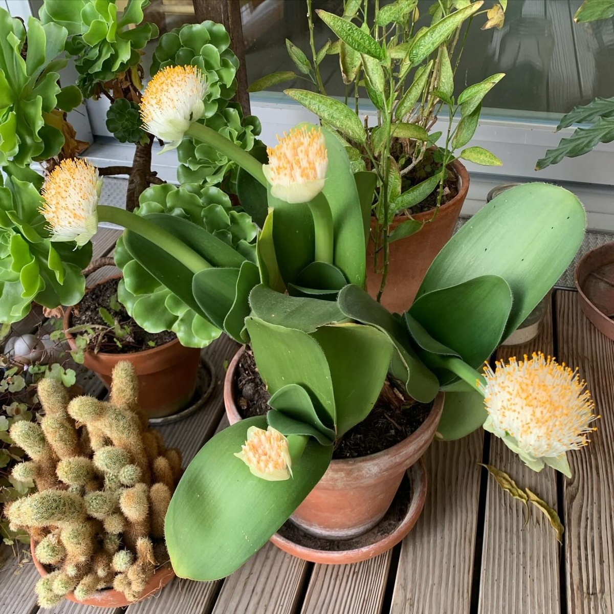 🌸 Гемантус — не самое распространенное, но удивительно эффектное луковичное растение, которое выделяется своей неординарной внешностью. Его название переводится с греческого как «кровавый цветок», но среди цветоводов он больше известен под другим, более живописным именем — «олений язык». И все благодаря уникальной форме его листьев: широких, мясистых, плотных и часто с бархатистой поверхностью. Главная особенность гемантуса — это его соцветия. В отличие от амариллисов, он цветет не крупными одиночными цветками, а пушистыми зонтиками, состоящими из сотен мелких цветочков с длинными тычинками. Чаще всего они бывают ярко-алыми или белыми (как у популярного Гемантуса белоцветкового (на фото)). В уходе гемантус достаточно прост. Он любит яркий, но рассеянный свет, умеренный полив (засуху переносит лучше, чем перелив), а зимой сокращение полива. Это причудливое растение — настоящая находка для тех, кто хочет добавить в свою коллекцию чего-то экзотического.