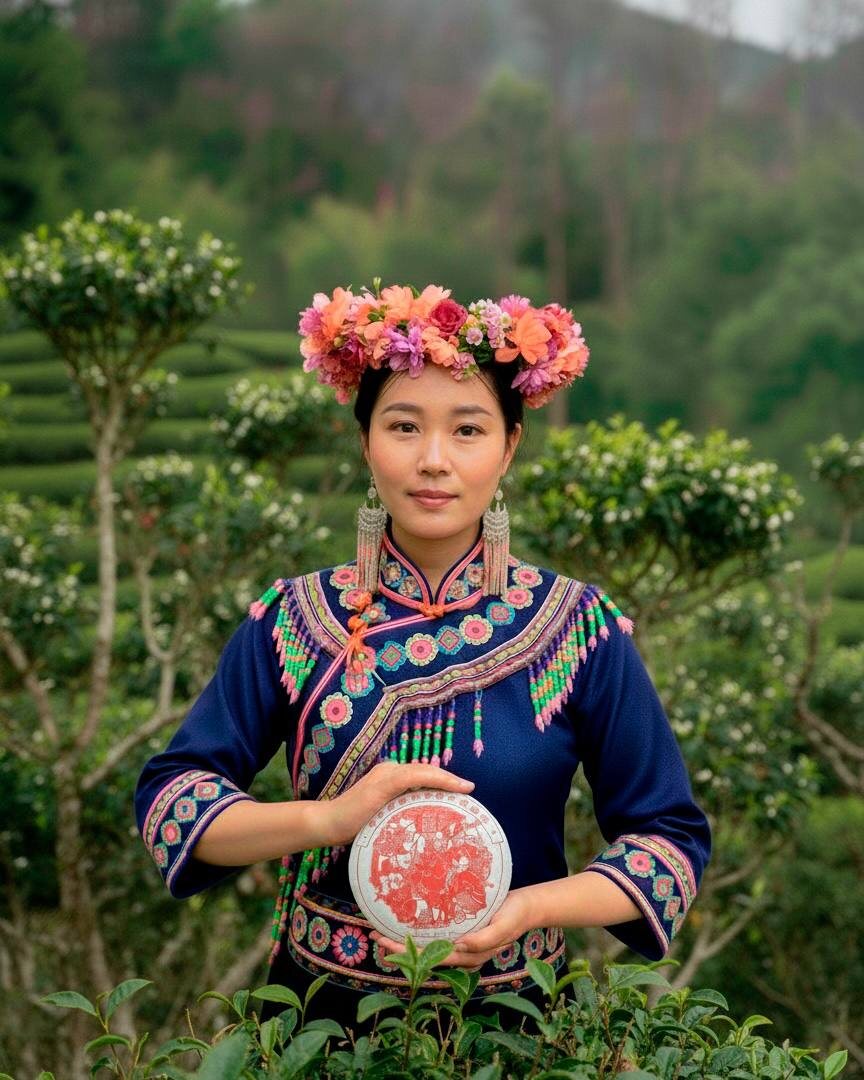 В поисках необычного Октябрь 2025. Юньнань. Мы ехали по Мэнхайскому серпантину в гости к старому другу нашего технолога. Дорога петляла между горами, и каждый поворот открывал новый вид на чайные сады. По приезду нас ждали небольшой дом и пару ангаров для производства чая. Выполнено всё в классическом стиле этих мест. Интересно, как тут, в удалённых деревнях провинции Юньнань, местным жителям удаётся сохранять свой уникальный культурный код. Нас радушно приветствовала дочь владельца дома в традиционном наряде народности Булан. Она отвела нас в комнату для чаепиий. Вэй (вкус) — плотный, обволакивающий, без горечи. Ци (энергия) — волна тепла, которая идёт от живота и разливается по телу. Как всегда, главным угощением для иностранных гостей стал шен пуэр. Бодрый, крепкий и сладкий. Но я большой фанат шу пуэров, и именно их мне интересно пробовать от разных фермеров-производителей из различных деревень. Там и состоялось моё знакомство с шу пуэром «Пять Сыновей». Кстати, до этого я ни ра
