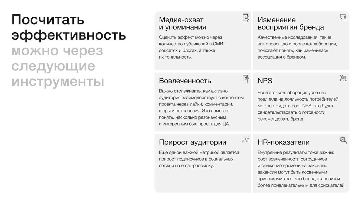 А если все-таки идете в искусство — делимся в формате «базовый минимум»: KPI для коллабораций с искусством (и не только).