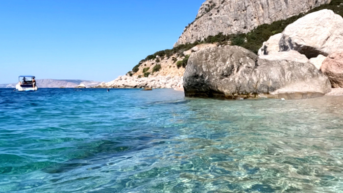Проходим вдоль обрывистых берегов с узкой полосой пляжей: «Серебряный», «Золотой», «Инжир». На склонах среди сосен и на каменистом берегу стоят палатки — люди приезжают на несколько дней, недель, а есть такие «робинзоны», которые проводят здесь всё лето.