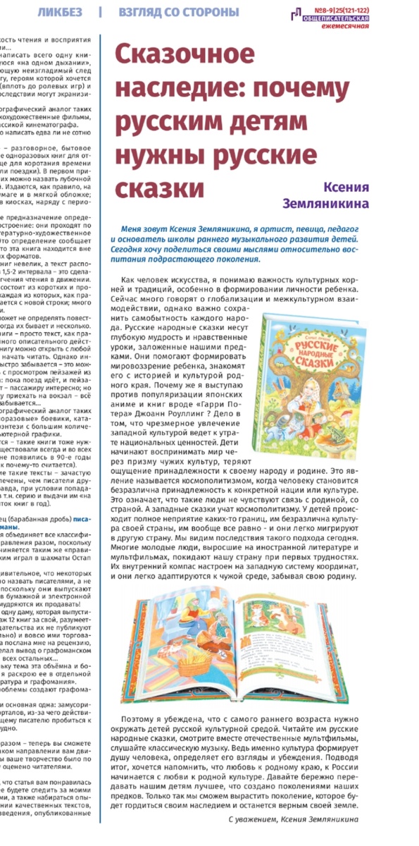 Дорогие друзья! Сегодня в "Общеписательской литературной газете" вышла моя статья "Сказочное наследие: почему русским детям нужны русские сказки" . https://t.me/olgliteratura/134 Я решила поделиться с вами своими размышлениями о важности воспитания детей в рамках родной культуры. Я обучаю детей музыке. На уроках мы поем русские народные песни. Водим хороводы. Читаем сказки. Чтение сказок на моих уроках сочетается с музыкой. Мы создаем музыкальные спектакли и ребенок сам выбирает себе роль, а малыши с удовольствием подпевают героям из русских народных сказок. Я считаю, что развитие детей должно быть всесторонним и литература также играет огромную роль в формировании личности ребенка. Наша русская культура богата народными сказками, песнями и традициями, которые веками передавались из поколения в поколение. Через эти произведения наши предки учили нас добру, справедливости и уважению к другим людям. Когда дети слышат и понимают такие истории, они формируют своё представление о ми