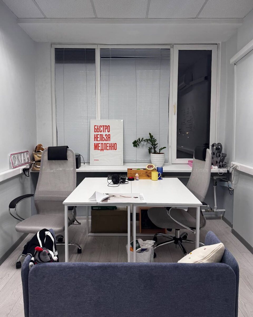 Захотелось вам про офис рассказать. Я уже давно поняла, что пространство вокруг, его визуальное наполнение — это моя поддержка и опора. Визуально гармоничные места и вещи наполняют меня энергией, но это совершенно не обязательно должны быть богатые и бежевые интерьеры, дорогие отели или улицы Парижа. Летом мы поняли, что нам нужен офис — по разным причинам. Запрос был такой: у нас есть очень маленький бюджет, нам важна транспортная доступность, важно, чтобы комната, пусть будет небольшой, но в ней можно собираться и что-то хранить. И по-возможности, чтобы это не было ужасным ужасом. Мы нашли офис быстро, за месяца полтора на Циане. Найти офис за 20 тысяч рублей в месяц в Москве не далеко от центра сложно, но можно. У нас совершенно немодный БЦ, с чуточку промышленным флером, линолеумом и аквариумом в коридоре. Подписывали договор мы в кабинете владельцев с кожаными зеленым диванами, портретом «царя» и дубовым столом, но это в целом неважно. Главное, мы смогли в этой комнатке на 11 к