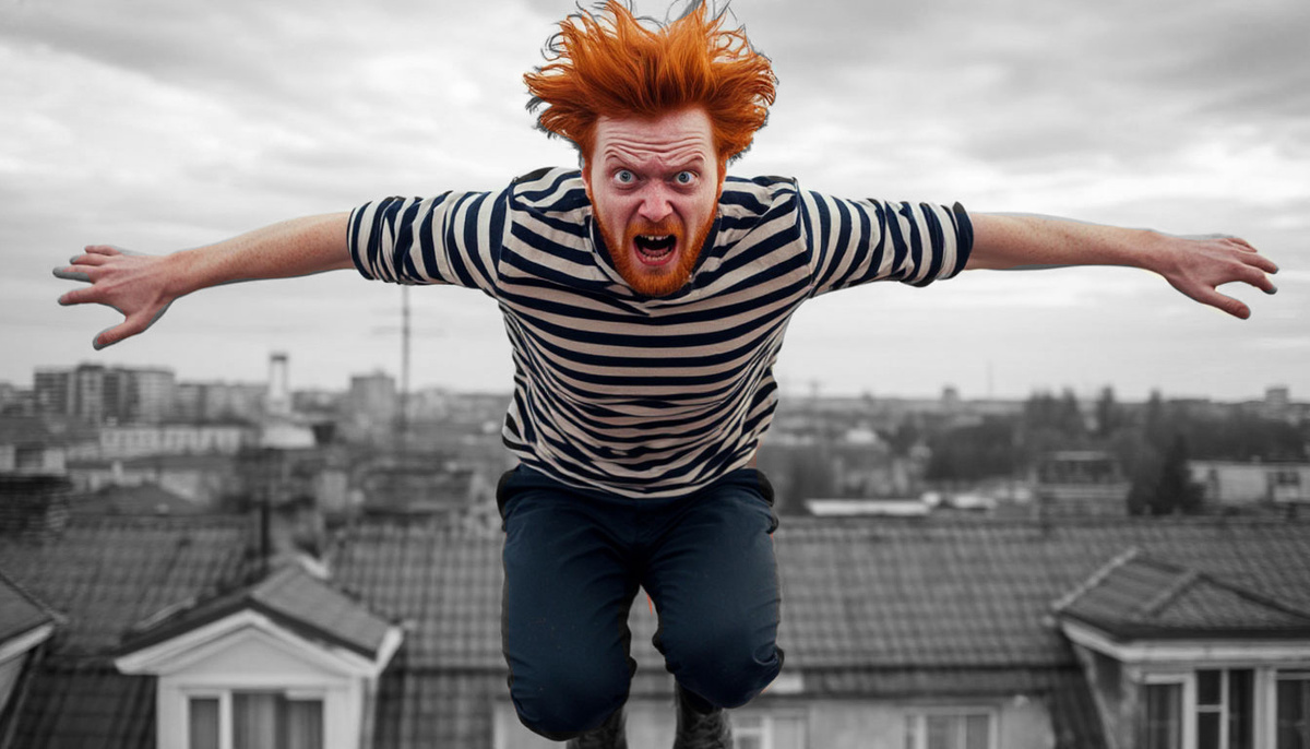 Они переглянулись и хотели что-то сказать друг другу, но вдруг увидели фигуру человека в чёрной рясе. Он сидел на краю крыши, свесив ноги, и что-то напевал сам себе.